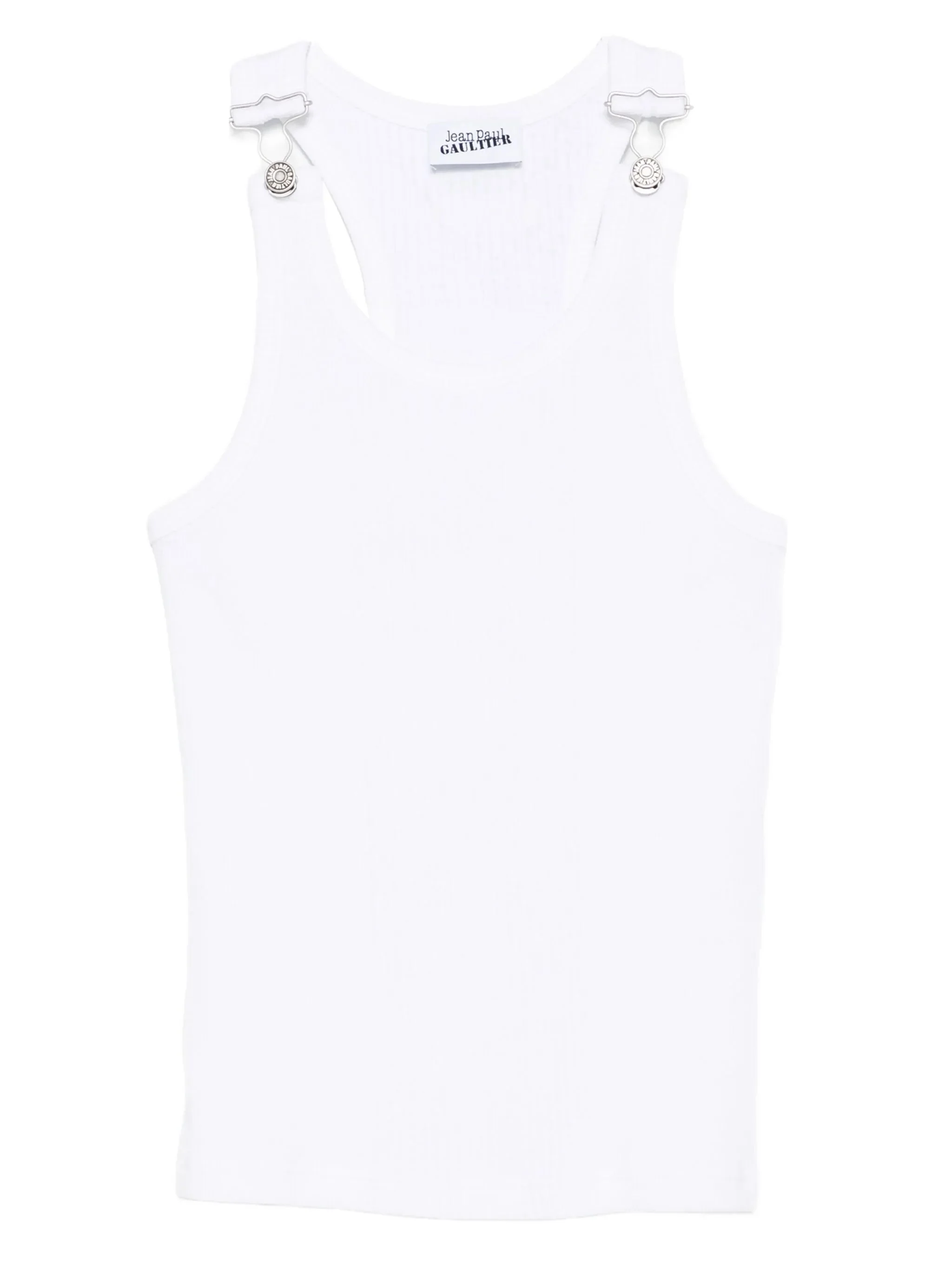 - white - ribbed fabric - sleeveless - round neck - embellished straps - clasp fastening Materials & Product Care Cotton 100% Size & Fit - Designed for a slim fit that sits just away from the body offering a close yet comfortable fit - Made from a midweight non-stretch fabric - The model is 1.77 m wearing size XS.