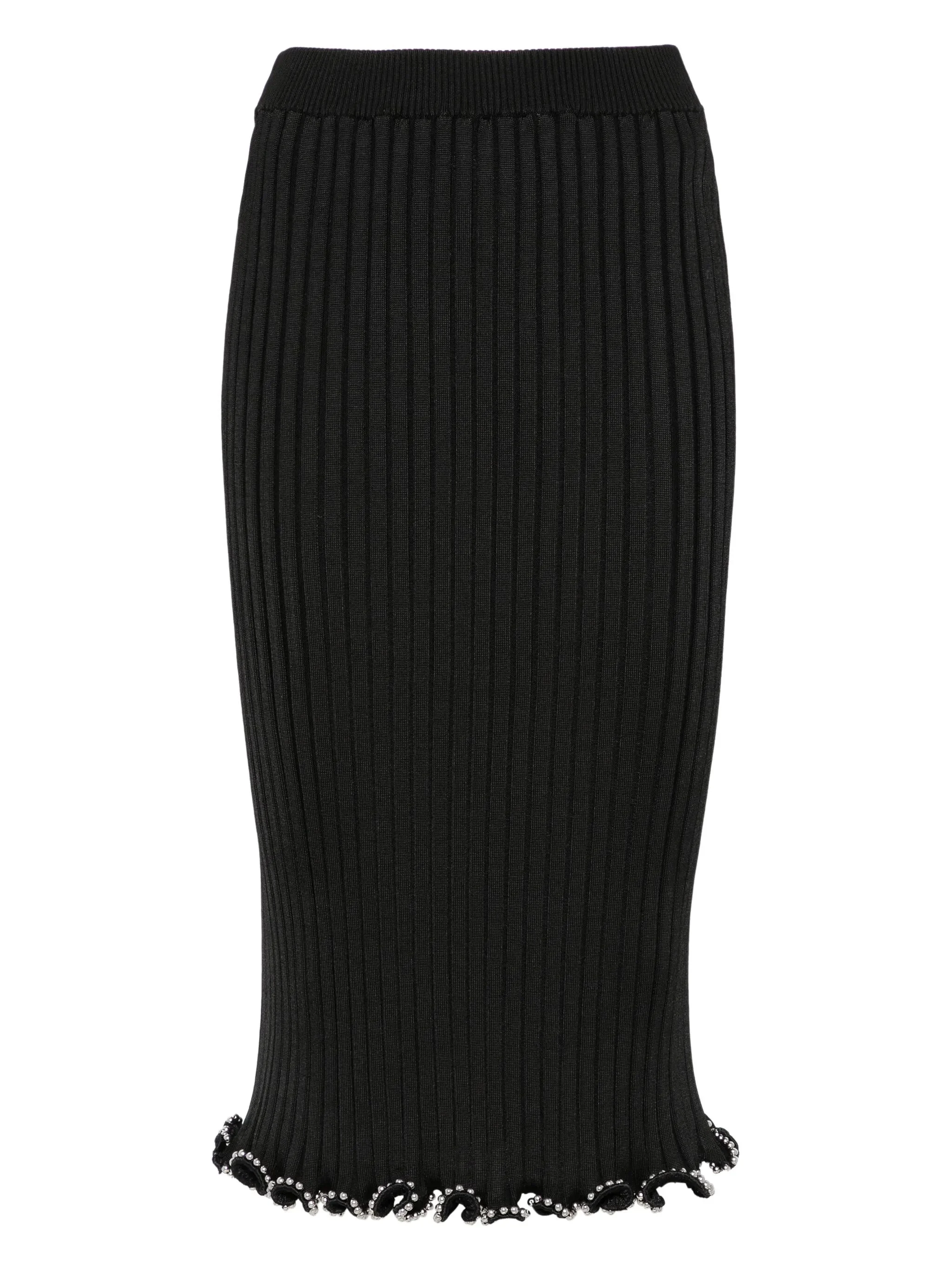 - black - elasticated waistband - lettuce hem - mid-length Materials & Product Care Polyamide 5%, Polyurethane 2%, viscose 93% Size & Fit - Made with a midweight knit, this piece offers some stretch - The elasticated waist allows for a comfortable fit - This midi-length skirt is intended to be worn high on the waist - The model is 1.79 m wearing size 32.