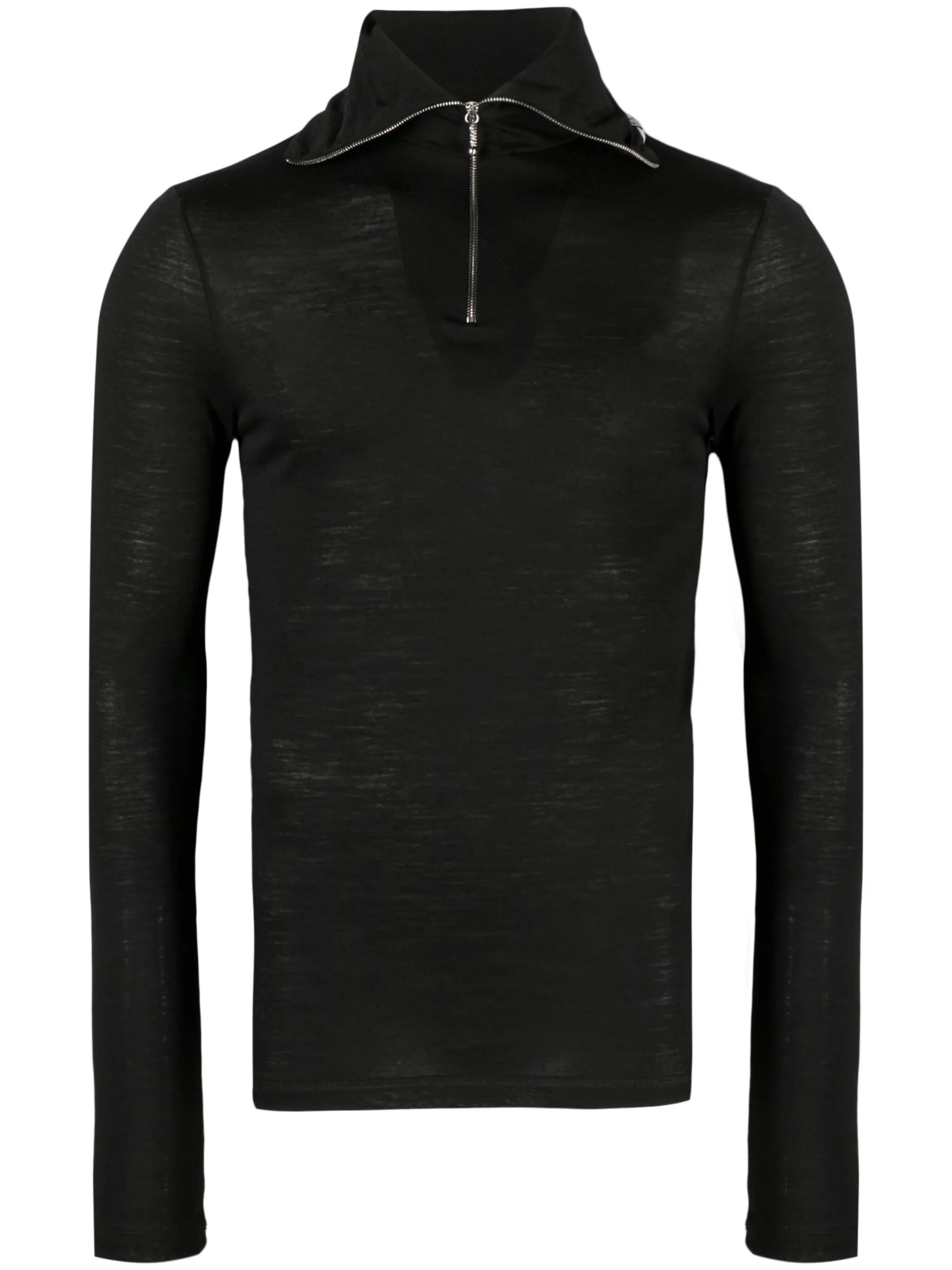 - black - logo print at the neckline - high neck - half front zip fastening - long sleeves - straight hem Materials & Product Care Polyester 55%, Virgin Wool 45% Size & Fit - Designed for a close fit throughout - Made from a lightweight non-stretch fabric, this piece offers minimal elasticity when worn - The model is 1.87 m wearing size M.