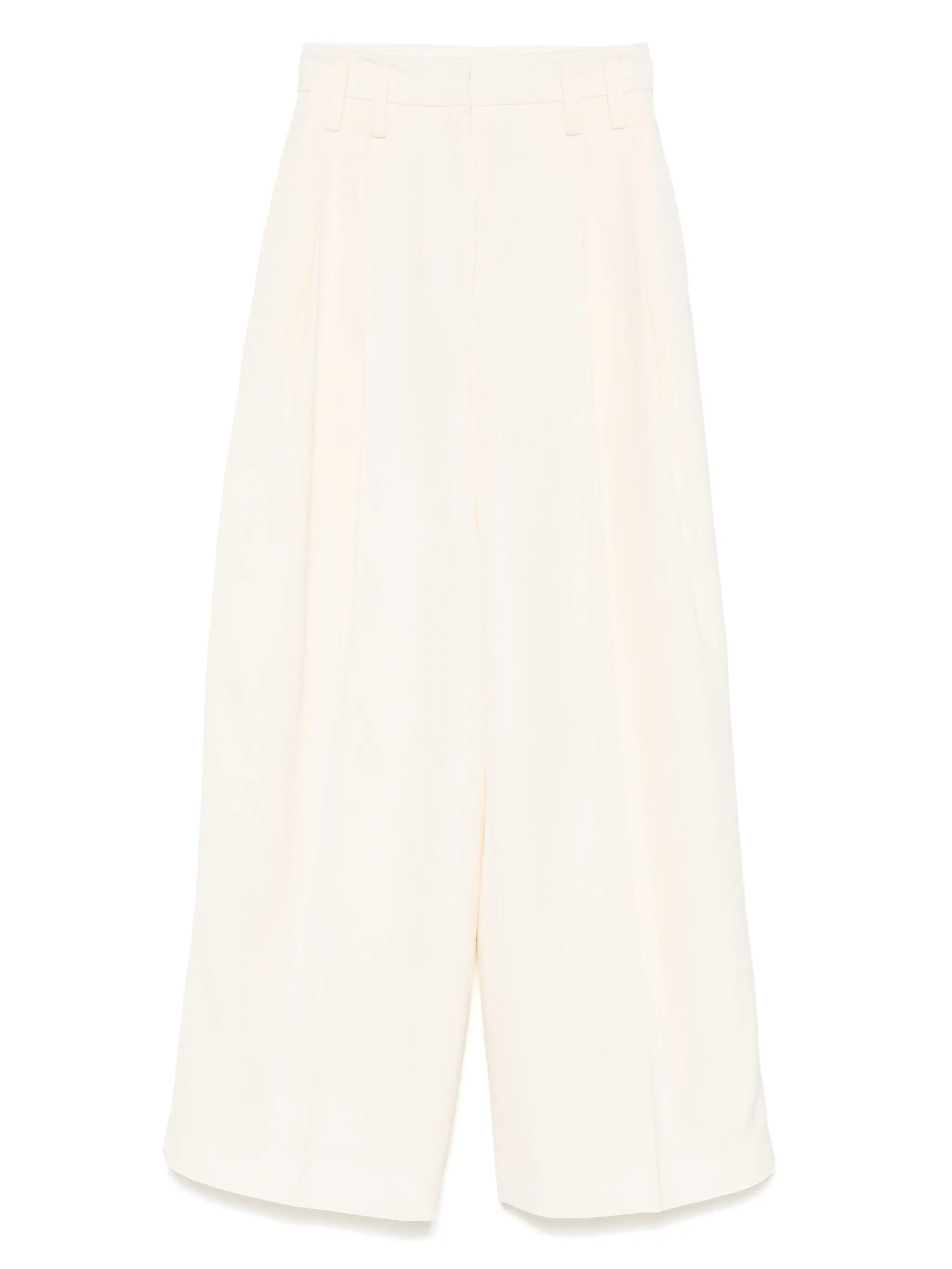 - light beige - concealed front button, hook and zip fastening - belt loops - two side inset pockets - two rear welt pockets Materials & Product Care Lining: Cotton 100%, Elastane 5%, viscose 95% Outer: Silk 42%, viscose 58% Size & Fit - Designed with a wide-leg cut, these trousers allow for a close fit at the waist and offer a loose and roomy fit over the leg - Made from a midweight non-stretch fabric - The model is 1.78 m wearing size 34.