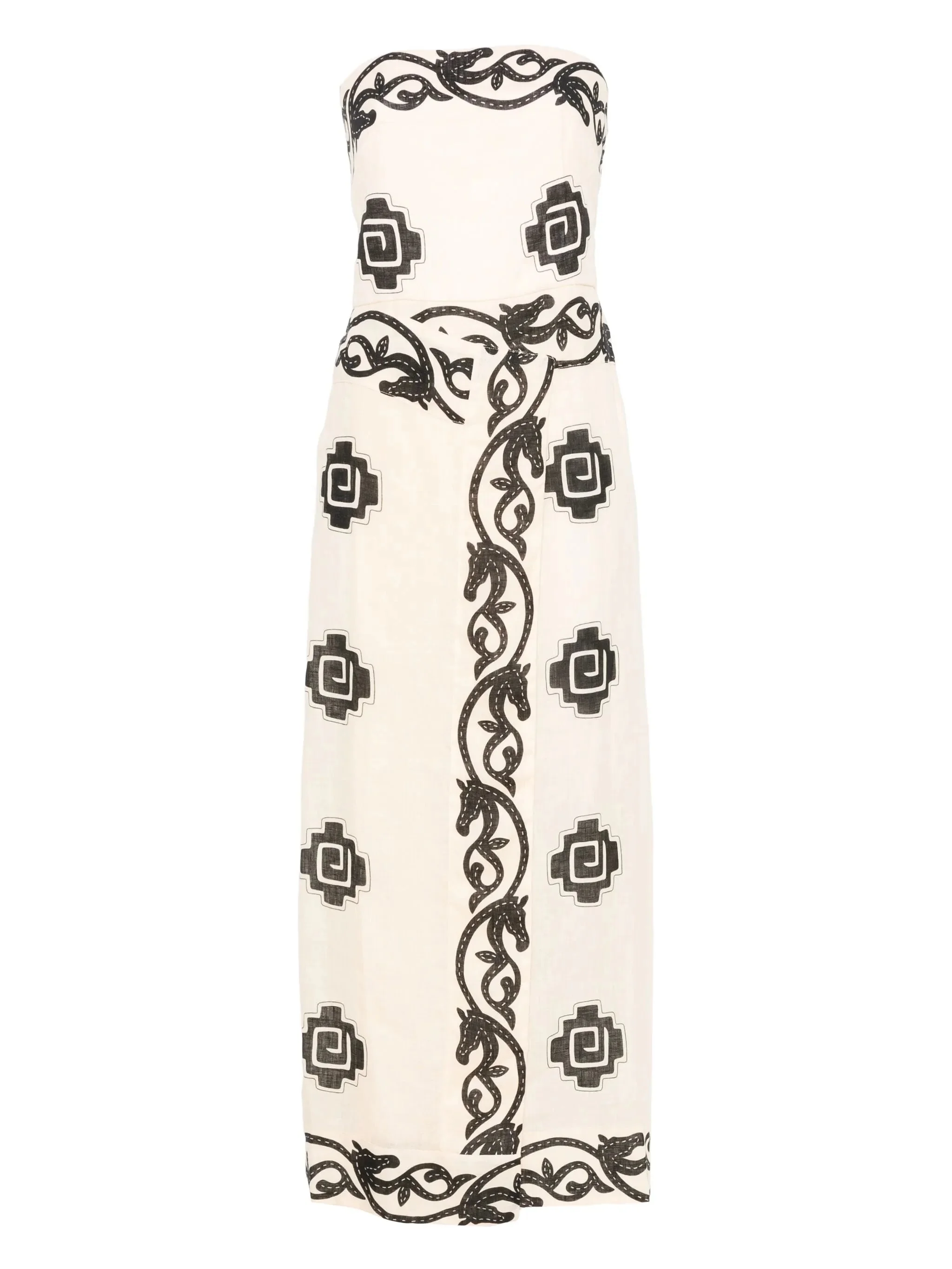 - light beige - smocked panel - strapless - geometric-pattern print - straight hem Materials & Product Care Lining: viscose 100% Outer: Linen/Flax 100% Size & Fit - Designed for a slim fit that sits just away from the body offering a close yet comfortable fit - Made from a midweight non-stretch fabric - The partially elasticated waistband offers increased movement and comfort at the waist - The model is 1.80 m wearing size 2.