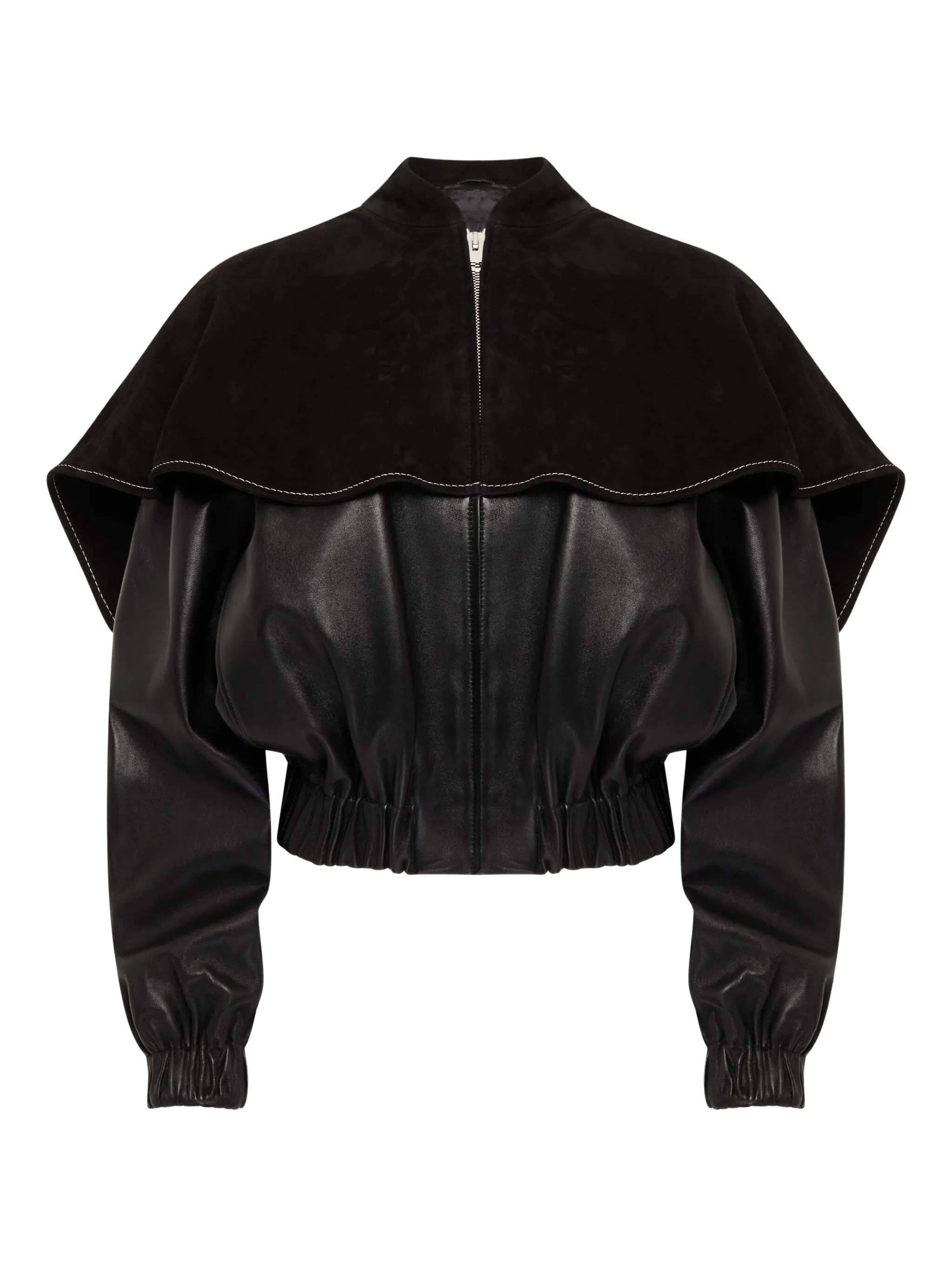 - black - front zip fastening - elasticated hem - stitch detailing - layered design Materials & Product Care Leather 100%