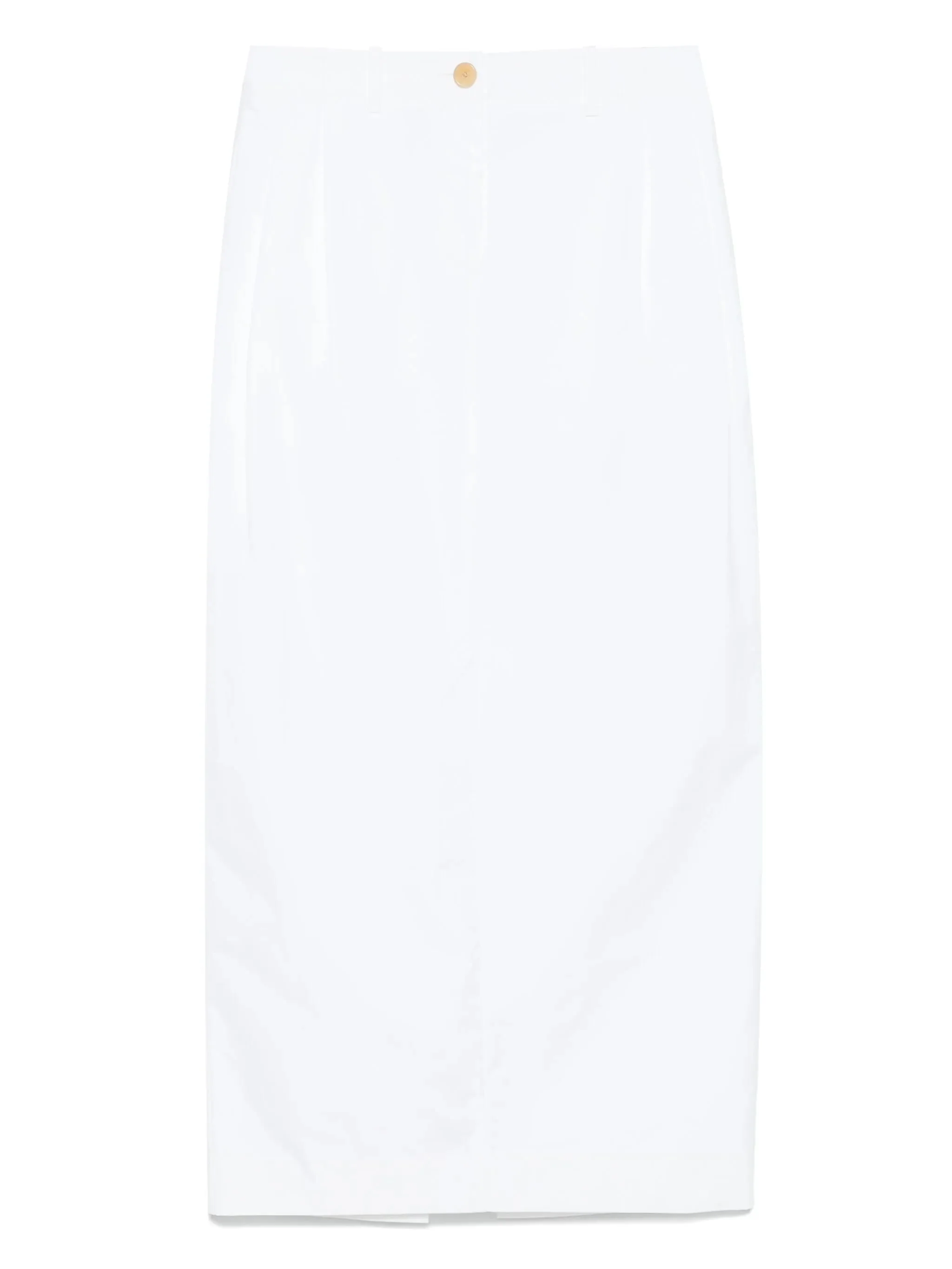 - white - front button fastening - two side slit pockets - two rear patch pockets - rear slit Materials & Product Care Lining: Silk 100% Outer: Organic Cotton 100% Size & Fit - Made from a midweight non-stretch fabric - This maxi-length skirt is intended to be worn low on the hips - The model is 1.80 m wearing size 2.