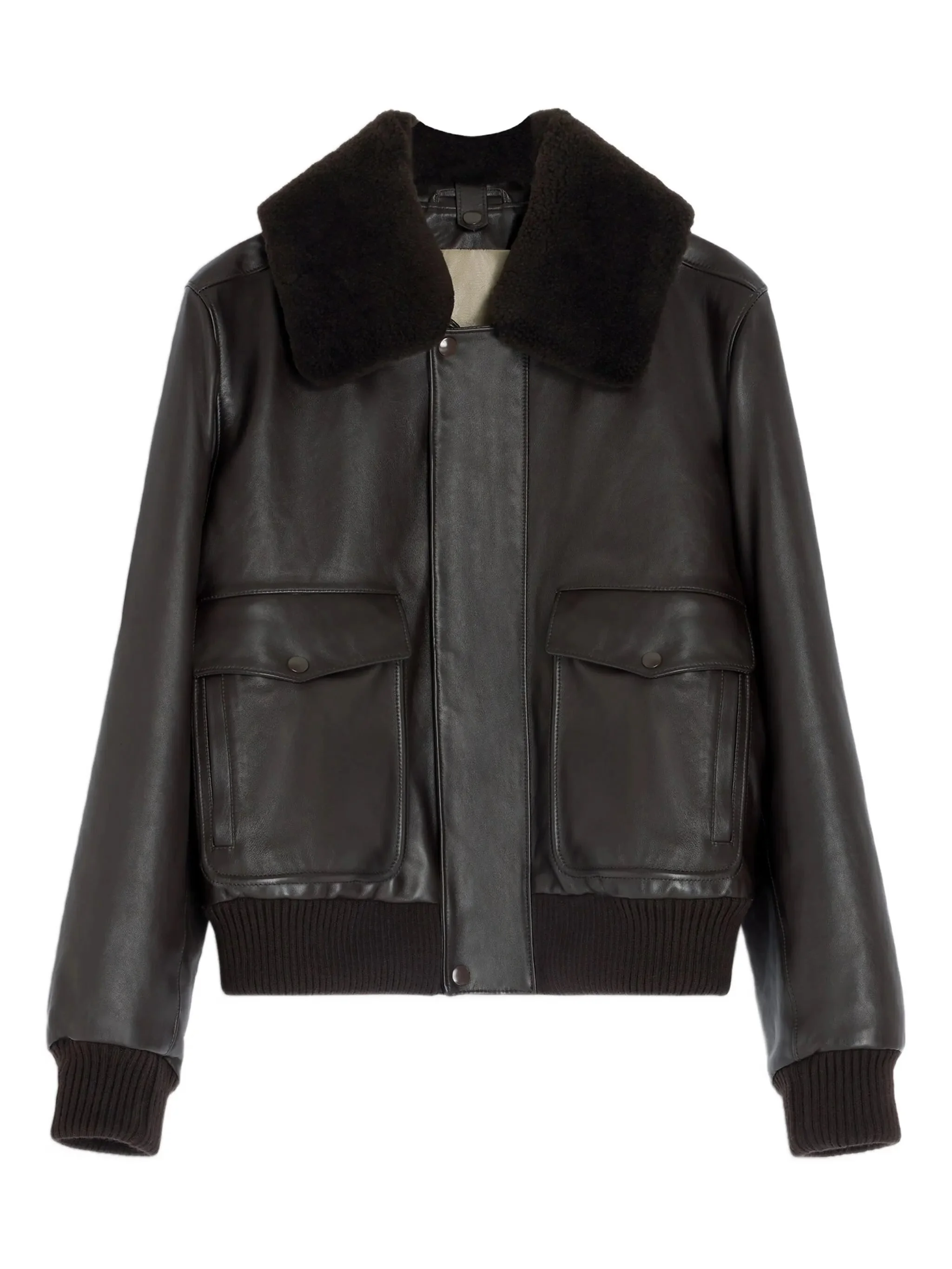 - black - leather construction - detachable sheepskin fur collar - zip and snap-button fastening - ribbed hem and cuffs - patch pockets Materials & Product Care Lining: Cotton 56%, viscose 44% Outer: Calf Leather 100%, Polylactic Acid (PLA) 40%, Sheep Skin/Shearling 100%, Silk 60%