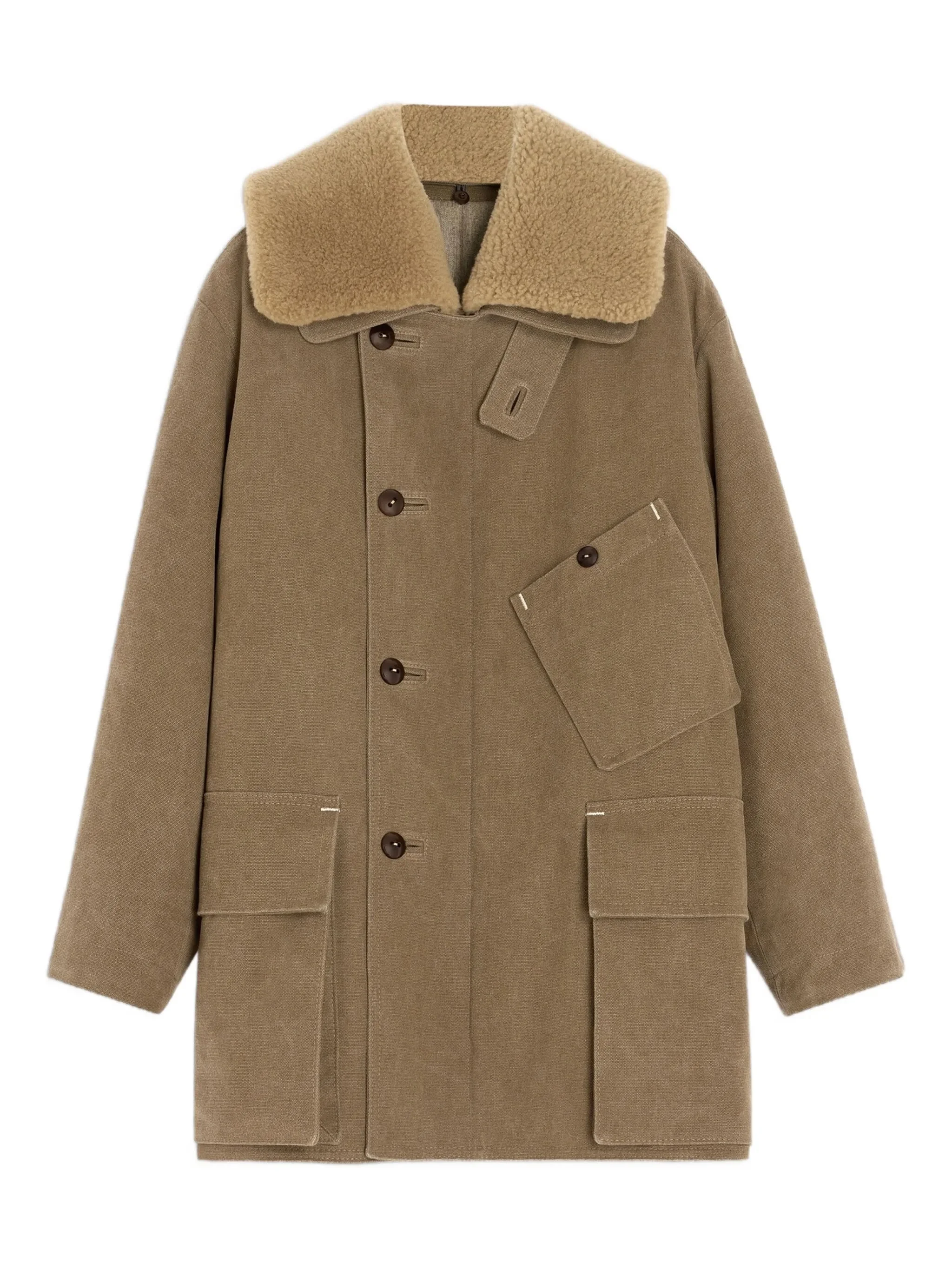 - beige - shearling collar - buttoned front - patch pocket - long sleeves Materials & Product Care Fabric 100%, Sheep Skin/Shearling 100%