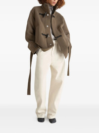 - dark brown - double-faced wool - stand-up collar - toggle fastening - belted waist - long sleeves button tabs Materials & Product Care Virgin Wool 100%