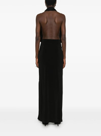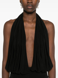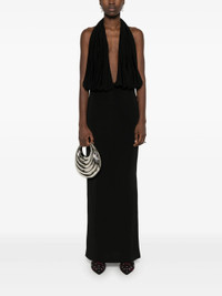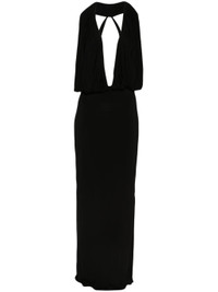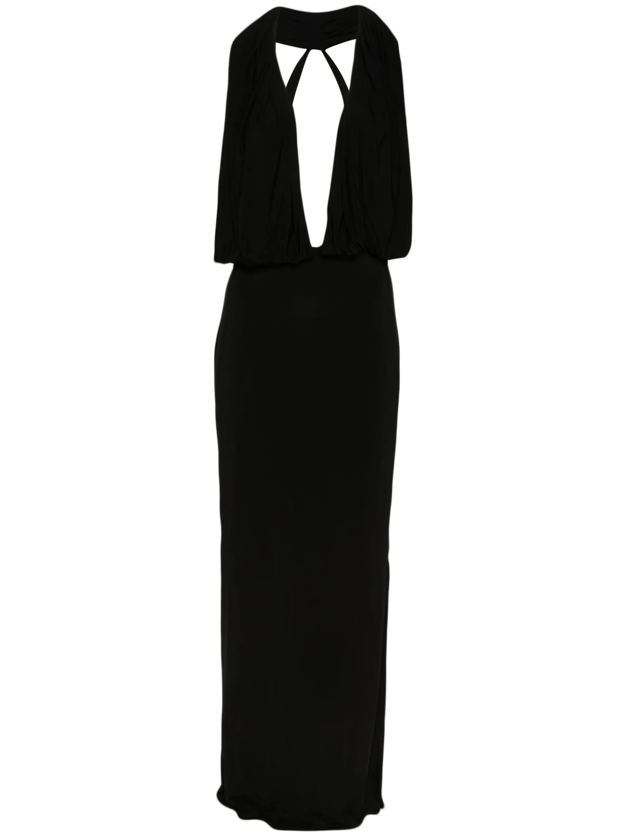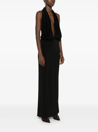 - black - stretch-jersey - halterneck - layered plunging V-neck - gathered detailing - sleeveless - elasticated underband - side slit - full-length - open back - straight hem - pull-on style Materials & Product Care Elastane 12%, viscose 88% Size & Fit - Designed for a loose fit at the chest with a close fit over the waist and hips - Made from a midweight stretch fabric, this piece offers elasticity and flexibility when worn - This piece fits true to size – take your usual size - The model is 1.80 m wearing size 36.