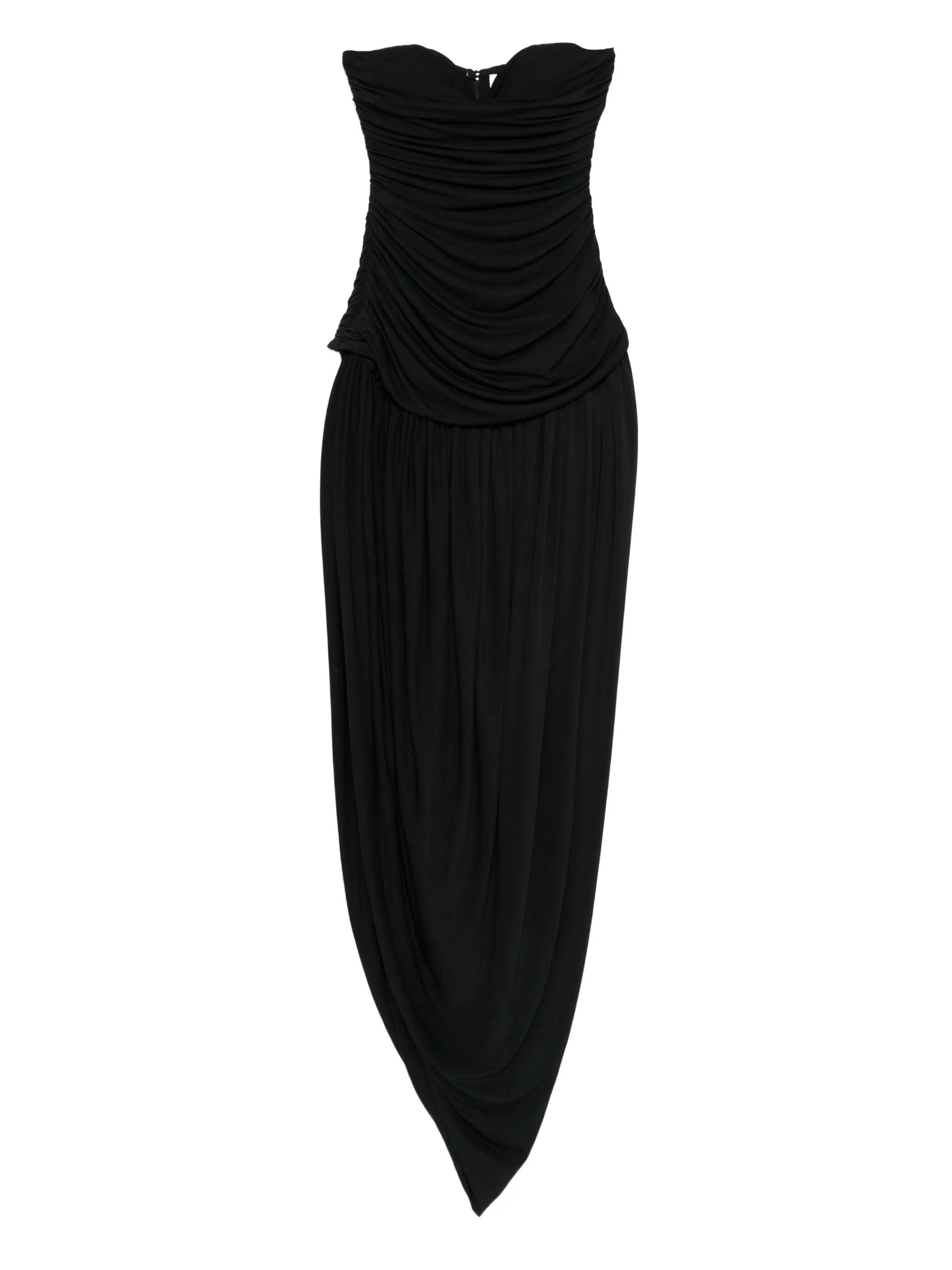 - black - strapless neckline - draped bodice - gathered waist - asymmetrical hem - flowing skirt Materials & Product Care Fabric 100% Size & Fit - The model is 1.75 m wearing size 38.