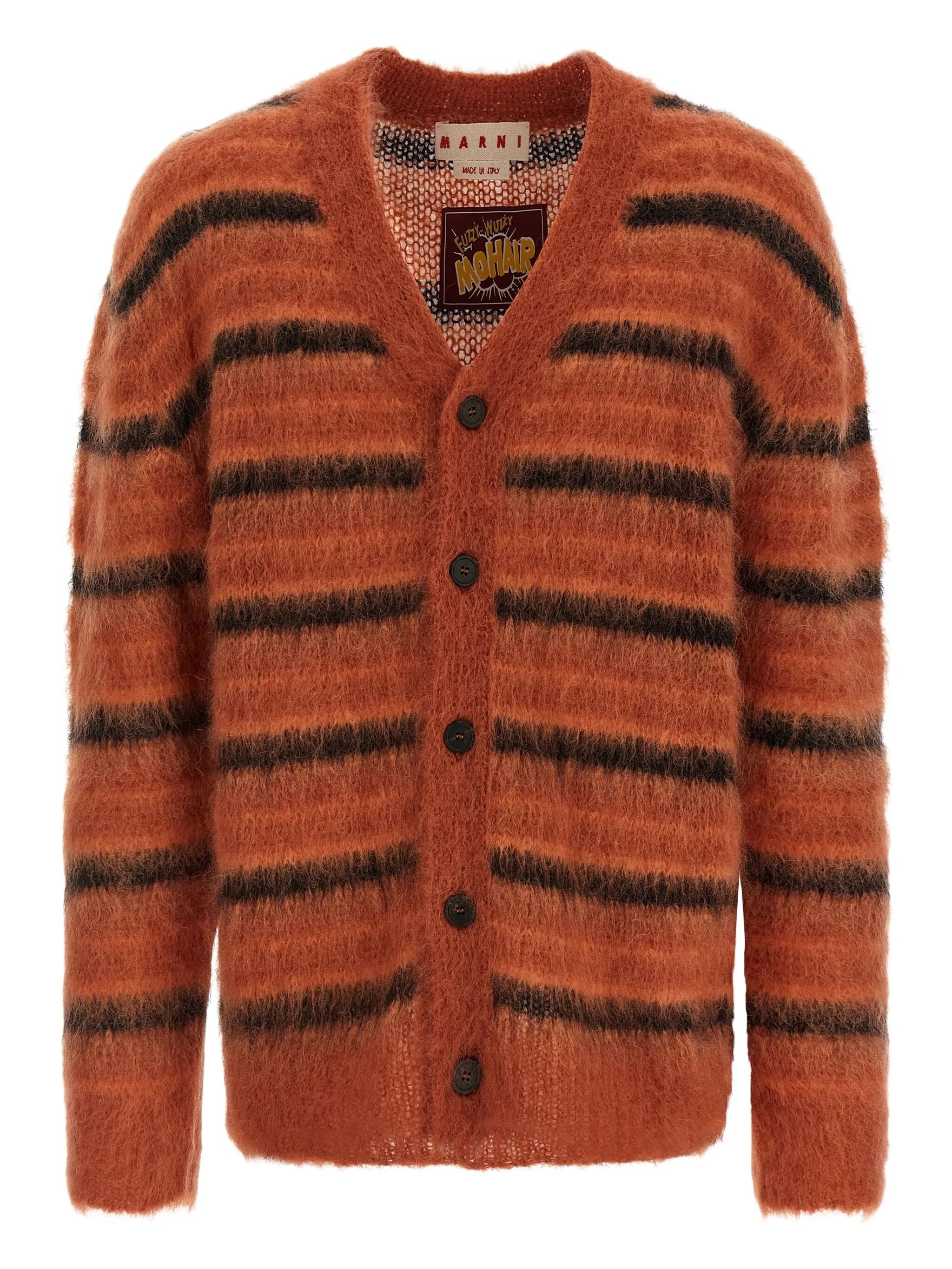 - orange - brushed finish - striped pattern - V-neck - button front - dropped shoulders Materials & Product Care Polyester 20%, Virgin Wool 80%