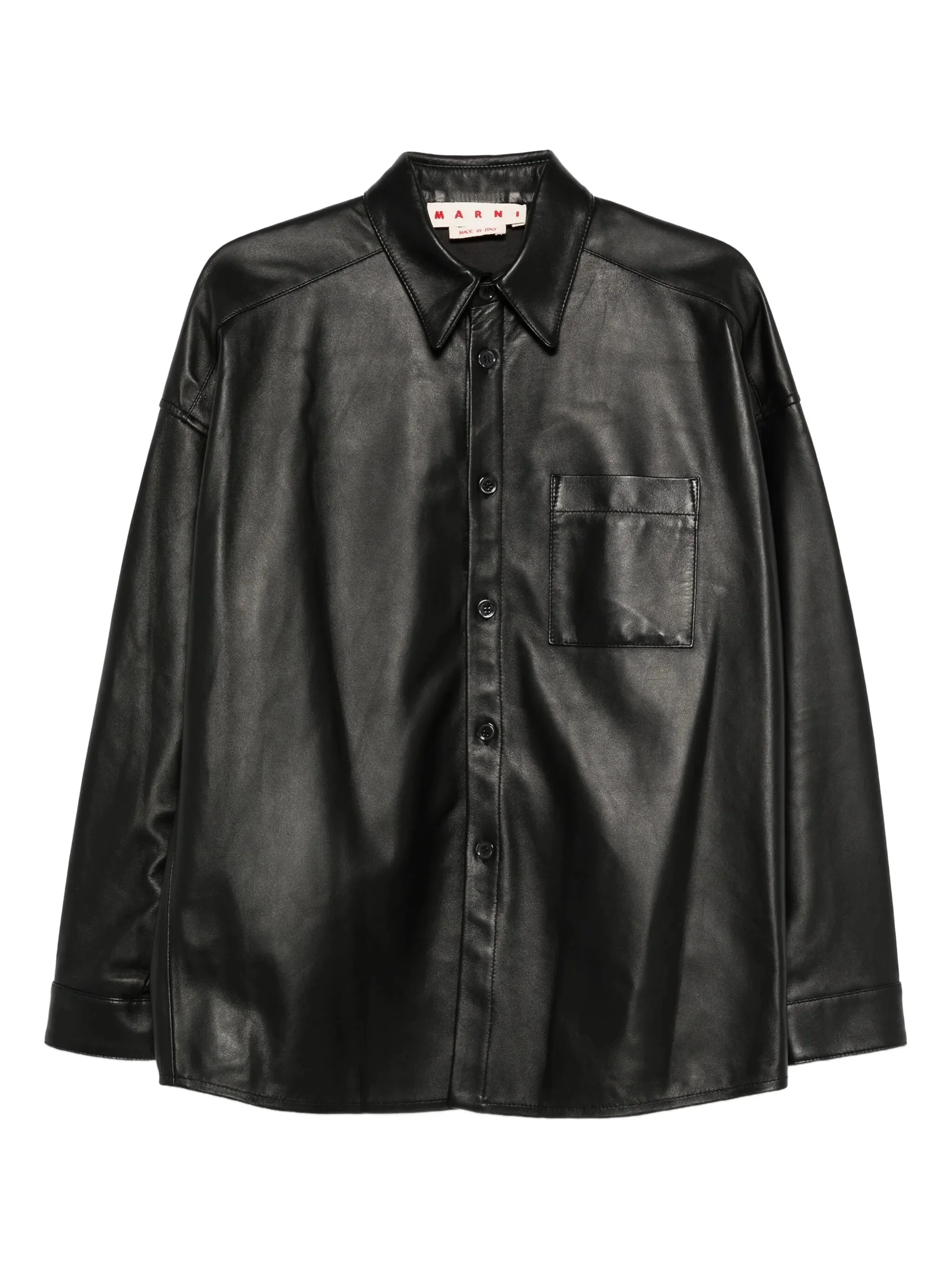 - black - front button fastening - chest patch pocket - drop shoulder - buttoned cuffs Materials & Product Care Lining: Cotton 69%, Polyamide 31% Outer: Calf Leather 100% Size & Fit - Designed to be unstructured, offering a loose fit throughout - Made from a midweight fabric - The model is 1.87 m wearing size 48.