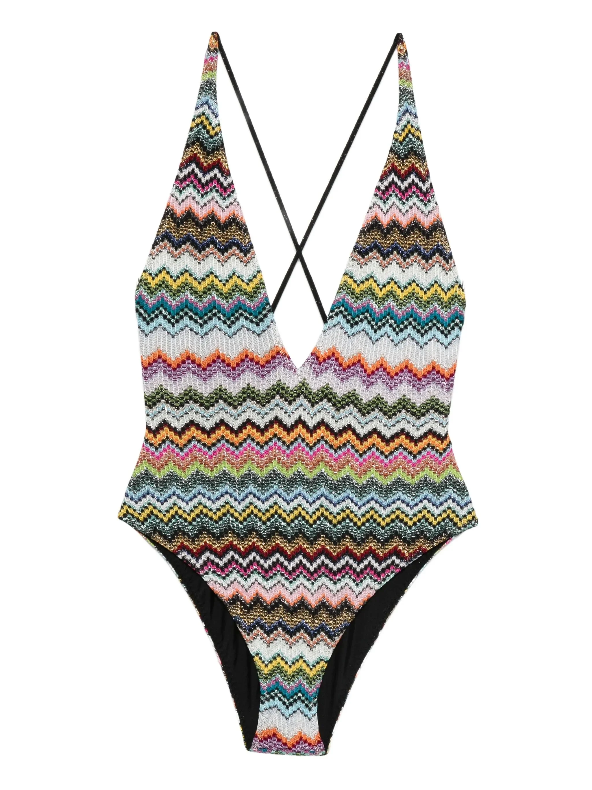 - multicoloured - chevron pattern - criss-cross straps - V-neck - The item you receive may differ slightly from the item photographed. This is due to the artisanal nature with which all Missoni products are constructed. - Be mindful to try on swimwear over your own garments. Materials & Product Care Lining: Elastane 20%, Polyamide 80% Outer: Metallised Fibres 17%, viscose 83%