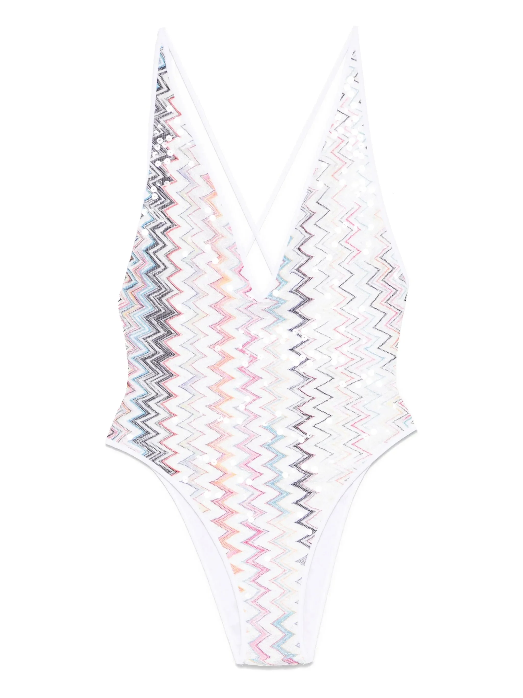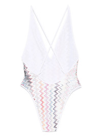 - white - plunging V-neck - rear criss-cross straps - Be mindful to try on swimwear over your own garments. - The item you receive may differ slightly from the item photographed. This is due to the artisanal nature with which all Missoni products are constructed. Materials & Product Care Lining: Elastane 20%, Polyamide 80% Outer: Polyester 36%, viscose 64%