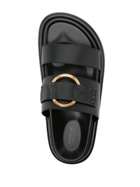 - black - calf leather - logo-engraved gold-tone hardware - strap detailing - slip-on style - open toe - branded moulded footbed - flat rubber sole Materials & Product Care Leather 100%