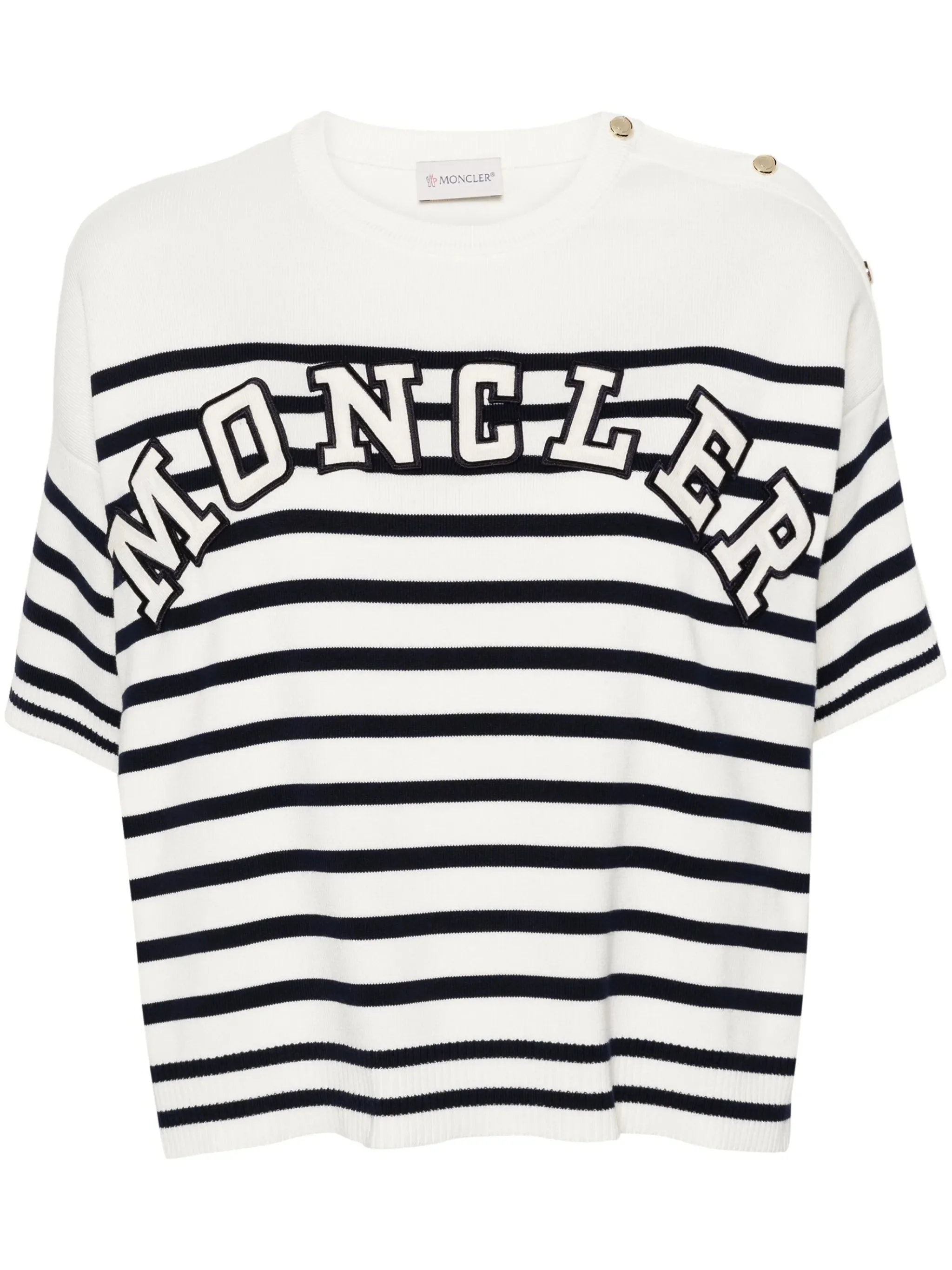 - ecru/navy blue - cotton - fine knit - horizontal stripe pattern - ribbed trim - logo patch lettering to the front - embossed gold-tone buttons - crew neck - drop shoulder - short sleeves - short side slits - straight hem - unlined - press-stud fastening at the shoulder Materials & Product Care Lining: Cotton 100%, Polyester 100% Outer: Cotton 100% Size & Fit - The model is 1.77 m wearing size S.