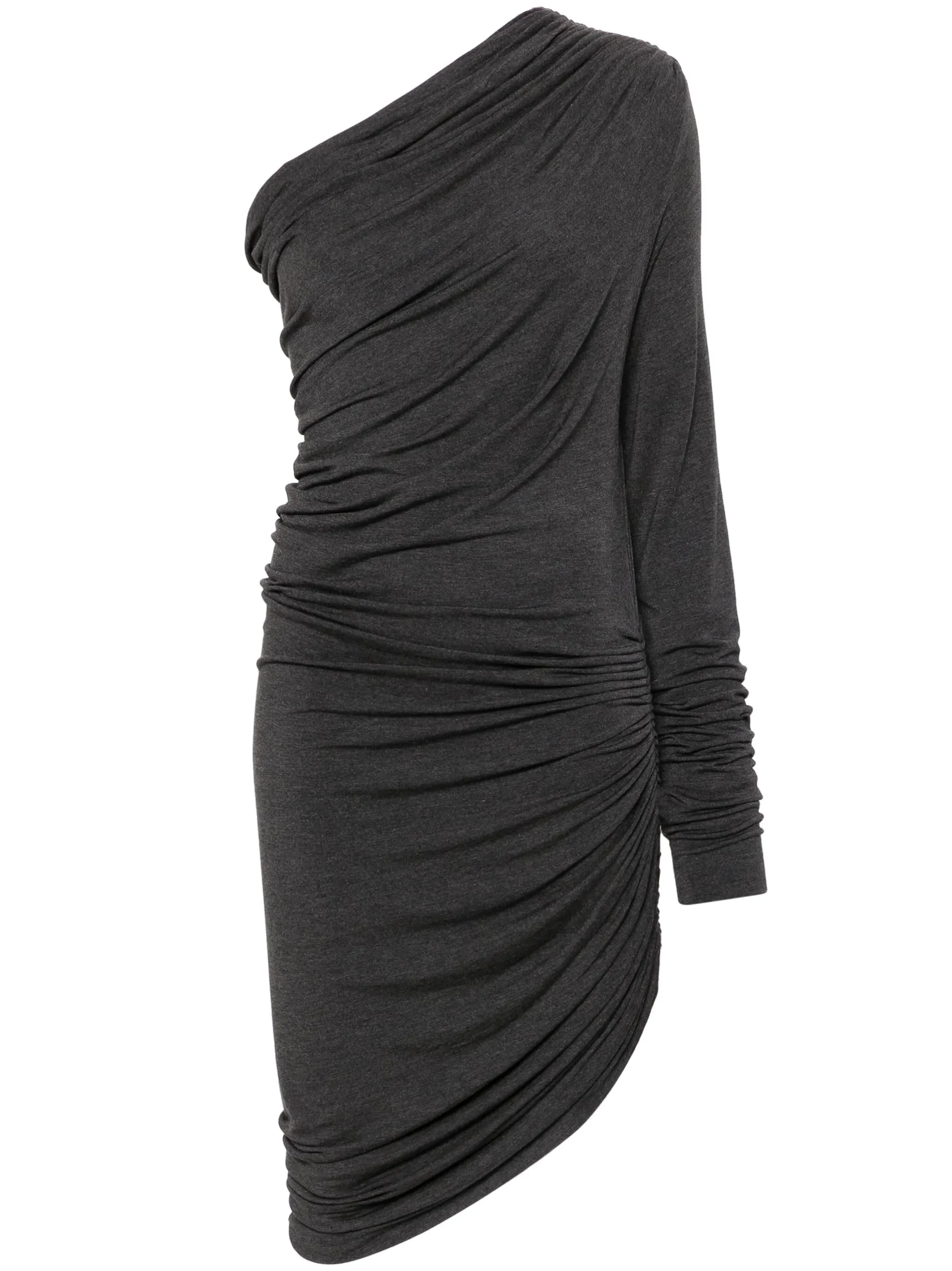 - charcoal grey - jersey texture - melange effect - ruched detailing - one-shoulder - single long sleeve - asymmetric hem - thigh-length - unlined Materials & Product Care Spandex/Elastane 5%, viscose 95% Size & Fit - Designed for a slim fit that sits just away from the body offering a close yet comfortable fit - Made from a midweight stretch fabric, this piece offers elasticity and flexibility when worn - This piece fits true to size – take your usual size - The model is 1.76 m wearing size S.