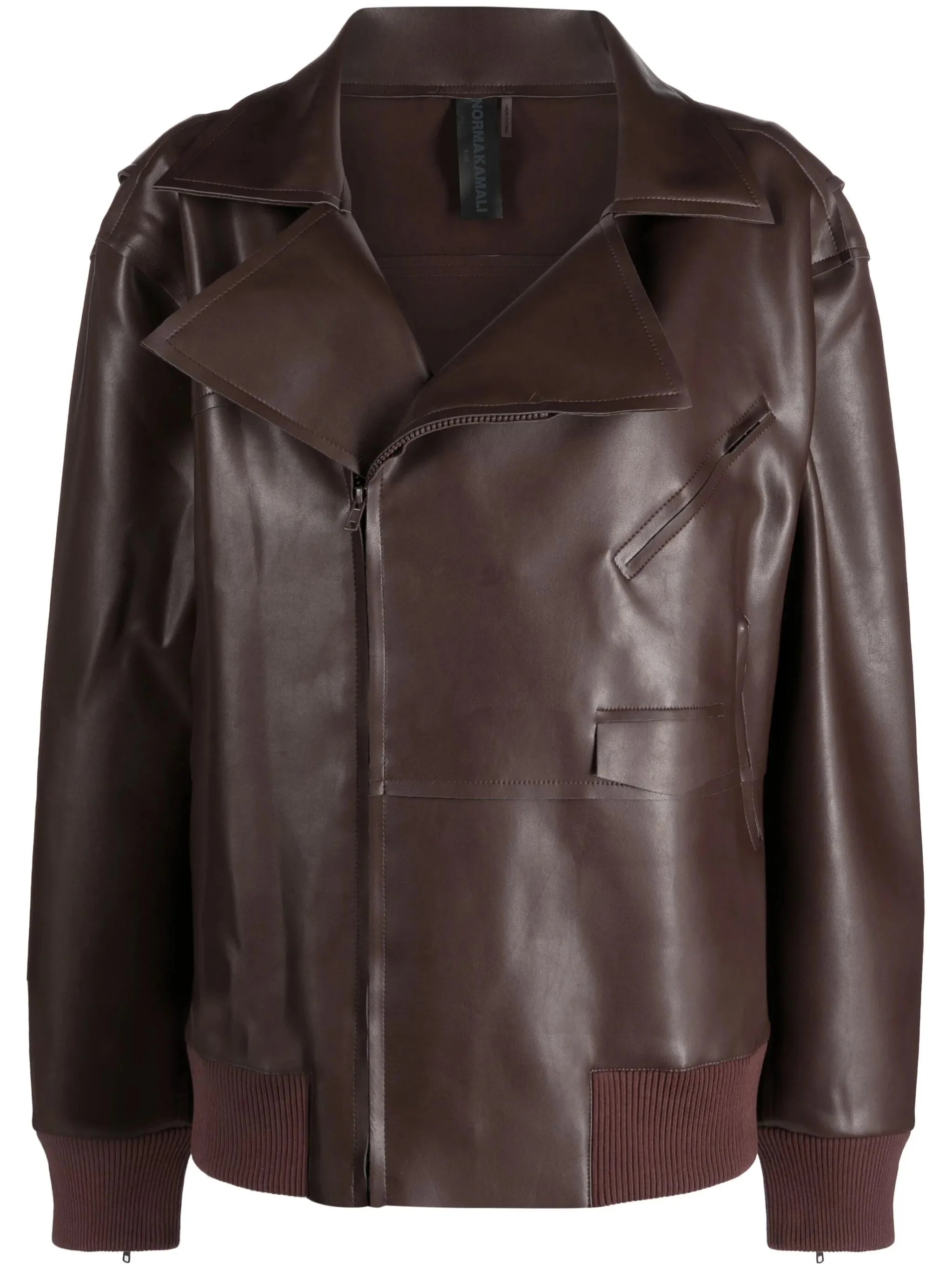 - chocolate brown - faux leather - bonded seams - wide notch lapels - off-centre front zip fastening - long sleeves - zip-fastening chest pocket - front flap pocket - two side zip-fastening pockets - ribbed cuffs and hem - unlined Materials & Product Care Lining: Polyester 90%, Spandex/Elastane 10% Outer: Polyester 95%, Polyurethane 100%, Spandex/Elastane 5% Size & Fit - The model is 1.79 m wearing size S.