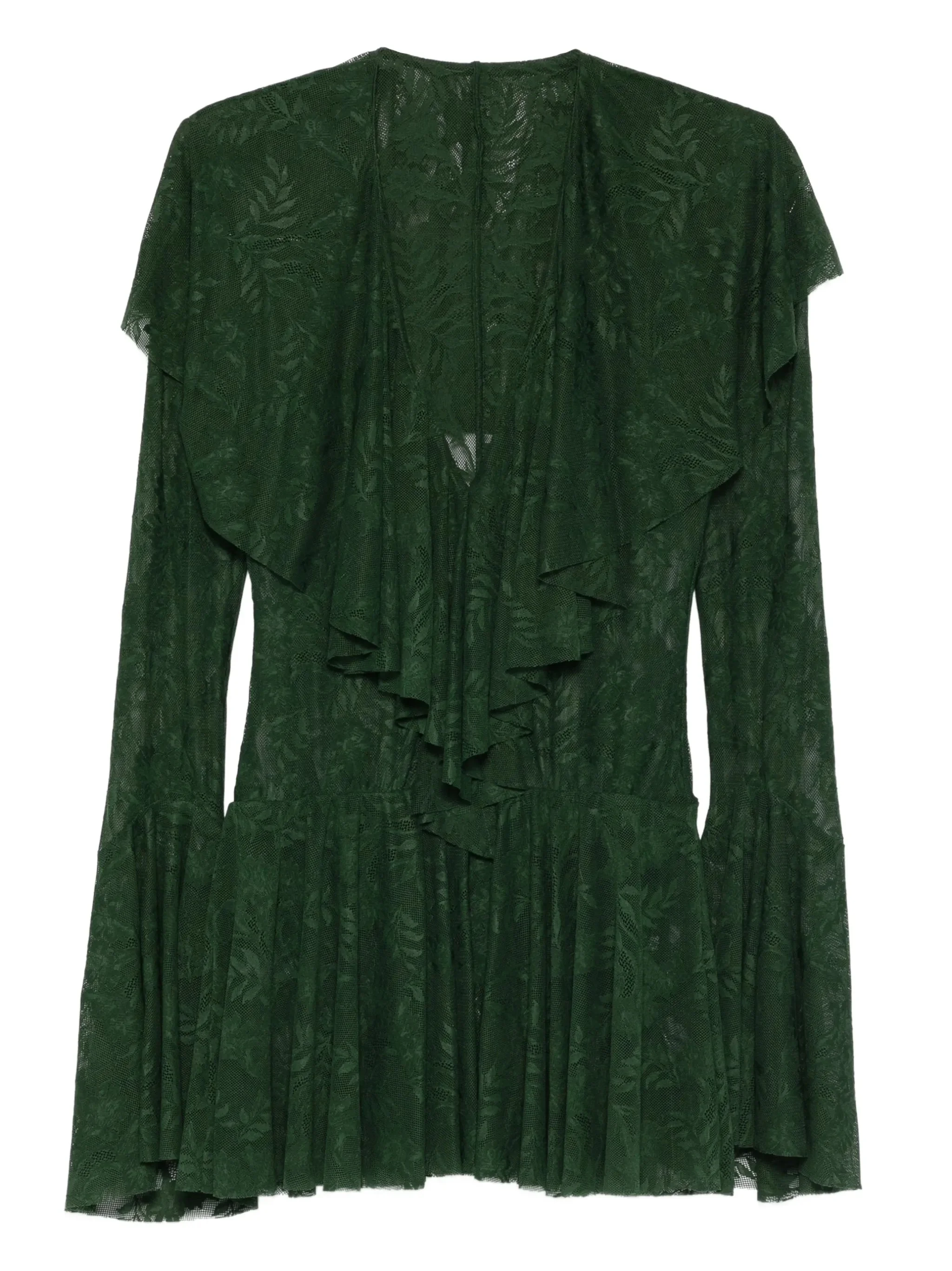 - green - deep V-neck - ruffle detail - long sleeves - flared sleeves - leaf pattern Materials & Product Care Nylon 81%, Spandex/Elastane 19% Size & Fit - The model is 1.78 m wearing size S.
