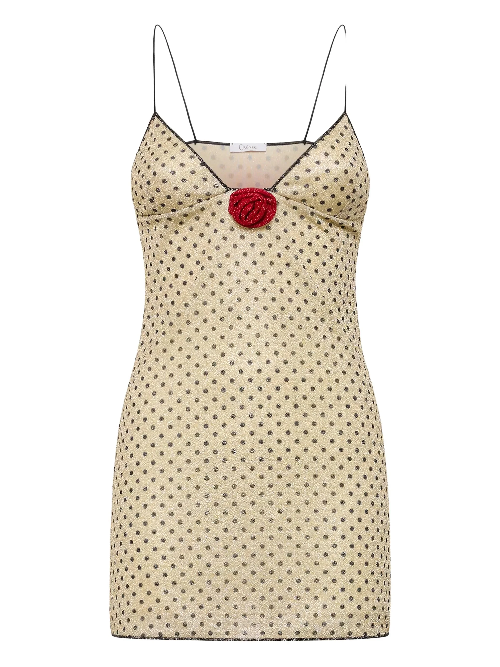 - beige and black - polka-dot print - rose applique - thin straps - V-neck - mini length Materials & Product Care Fabric 100%
