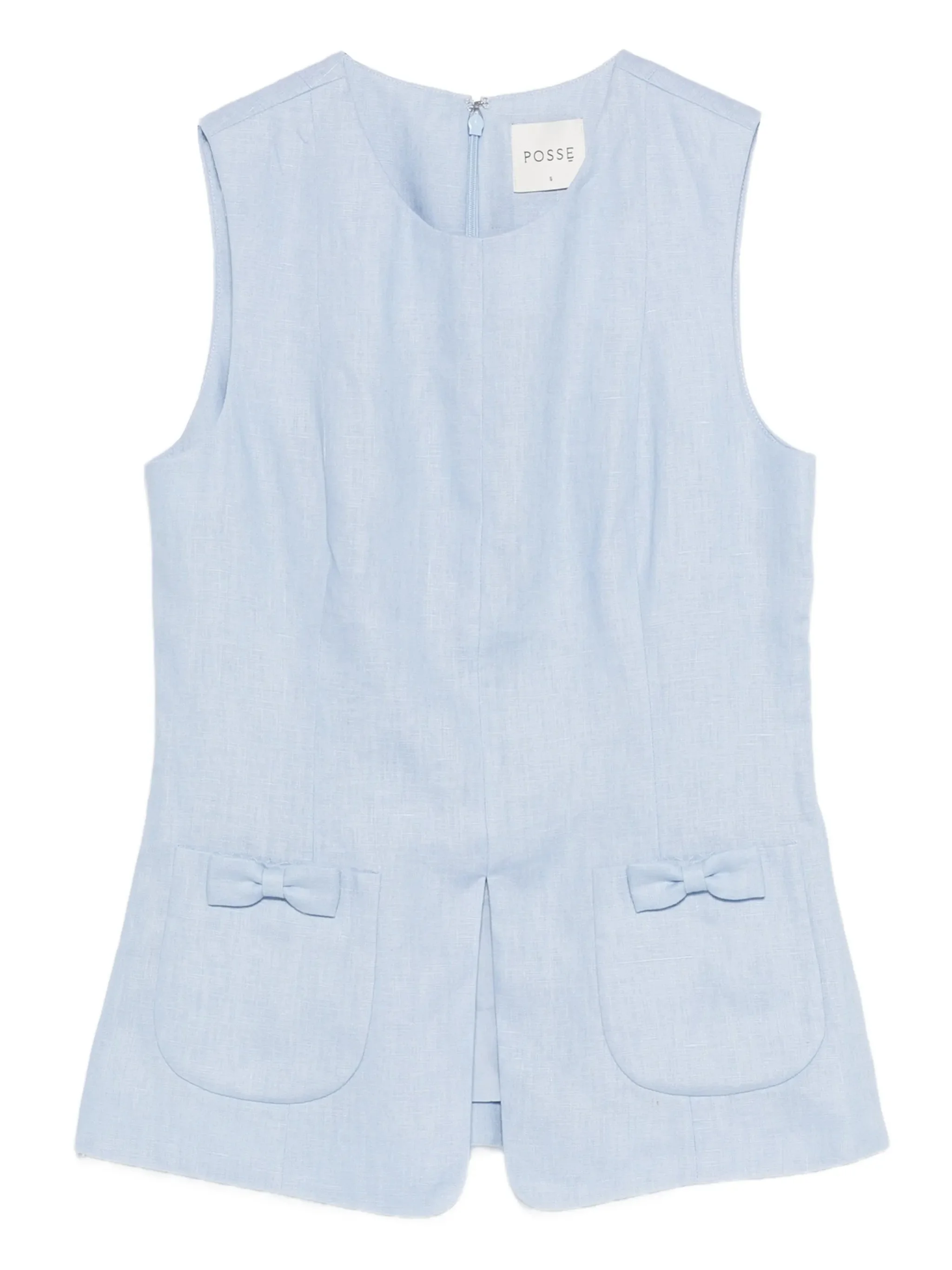 - blue - round neck - sleeveless - two front pockets - bow detail - back zip fastening Materials & Product Care Lining: Cotton 100% Outer: Linen/Flax 100% Size & Fit - The model is 1.78 m wearing size S.