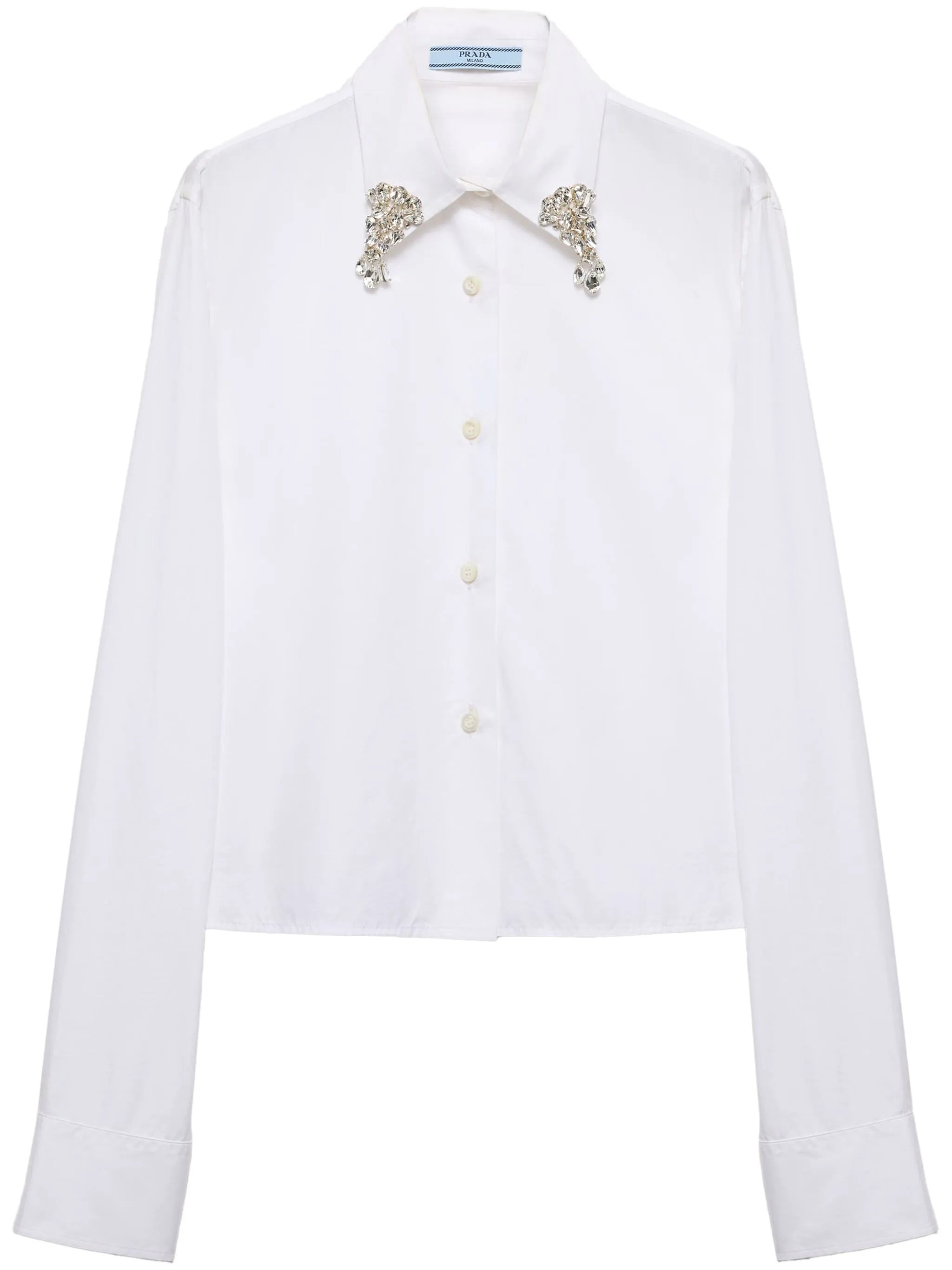 - white - cotton - poplin texture - front button fastening - straight-point collar - crystal embellishment - long sleeves - buttoned cuffs - triangle logo to the rear - straight hem Materials & Product Care Cotton 100%