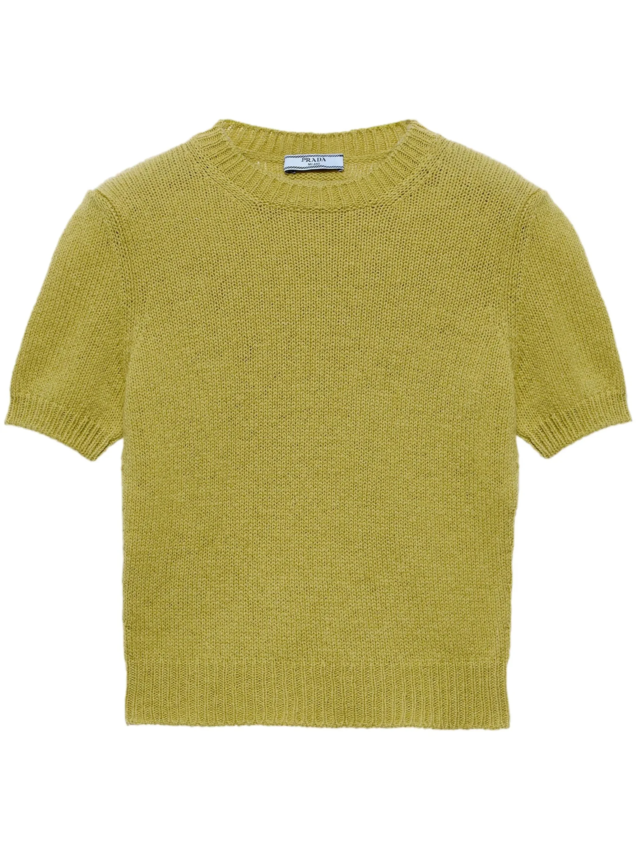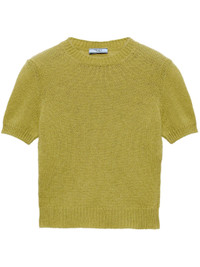 - avocado green - cashmere - fine knit - triangle logo - crew neck - short sleeves - straight hem - ribbed trim - straight hem Materials & Product Care Cashmere 100%