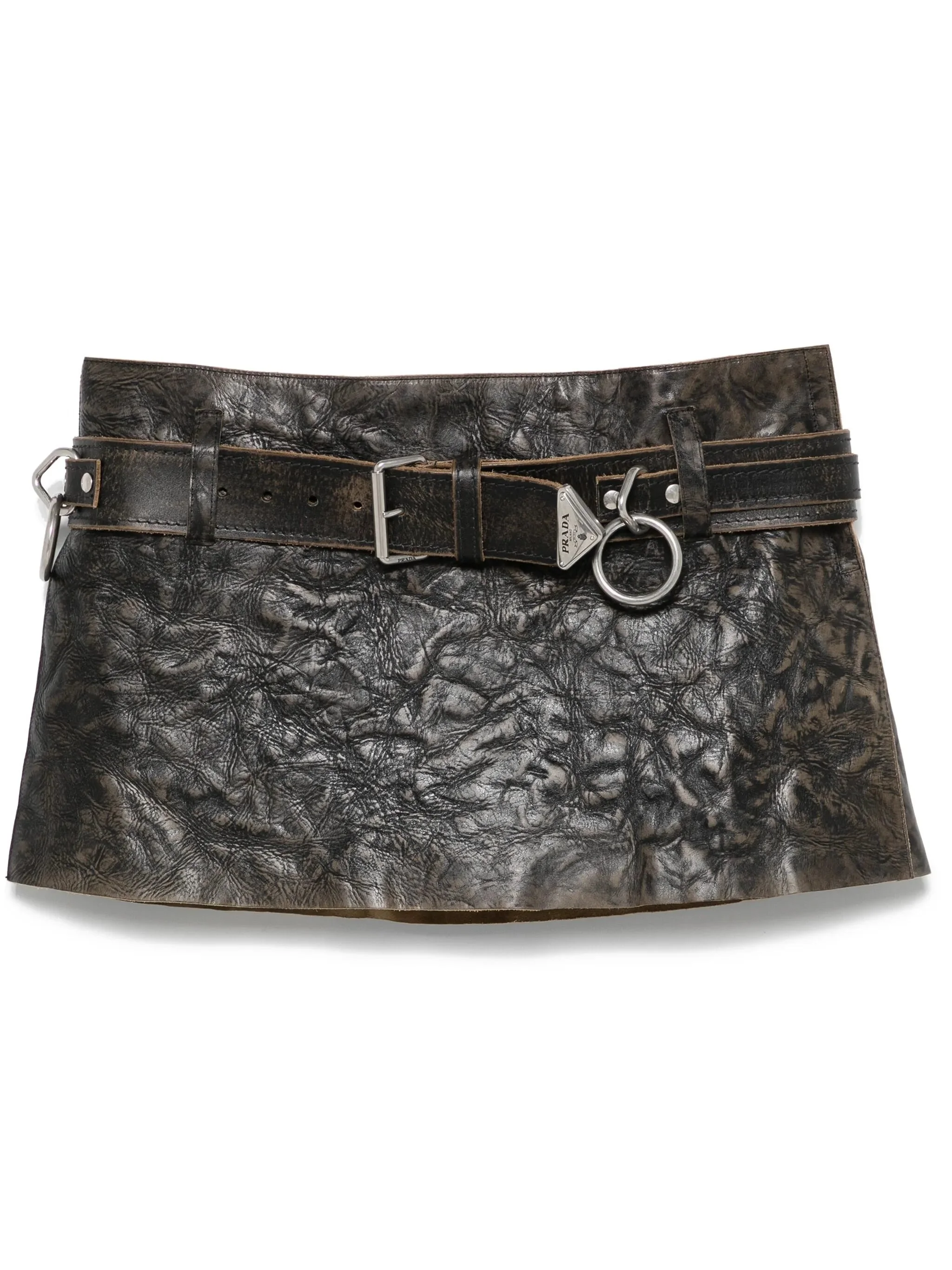 - black - belted waist - belt loops - ring hardware detailing - triangle logo Materials & Product Care Calf Leather 100% Size & Fit - Firm leather offering little flexibility to maintain its durability and sturdiness - This mini-length skirt is intended to be worn low on the hips - The model is 1.76 m wearing size 40.