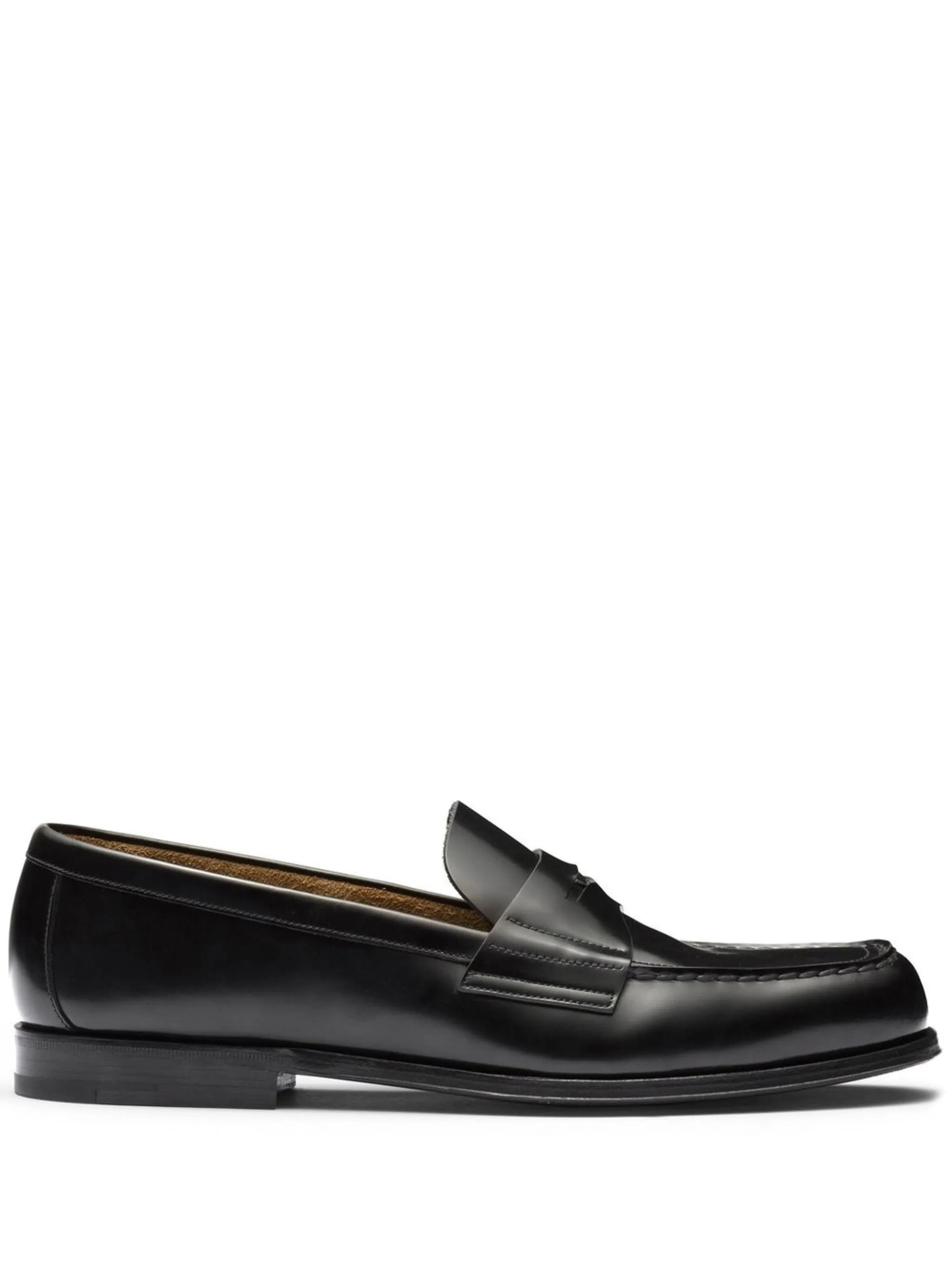 - black - leather - enamel triangle logo - penny slot - tonal stitching - branded insole - almond toe - slip-on style - low block heel Materials & Product Care Lining: Leather 100% Outer: Leather 100% Sole: Leather 100%