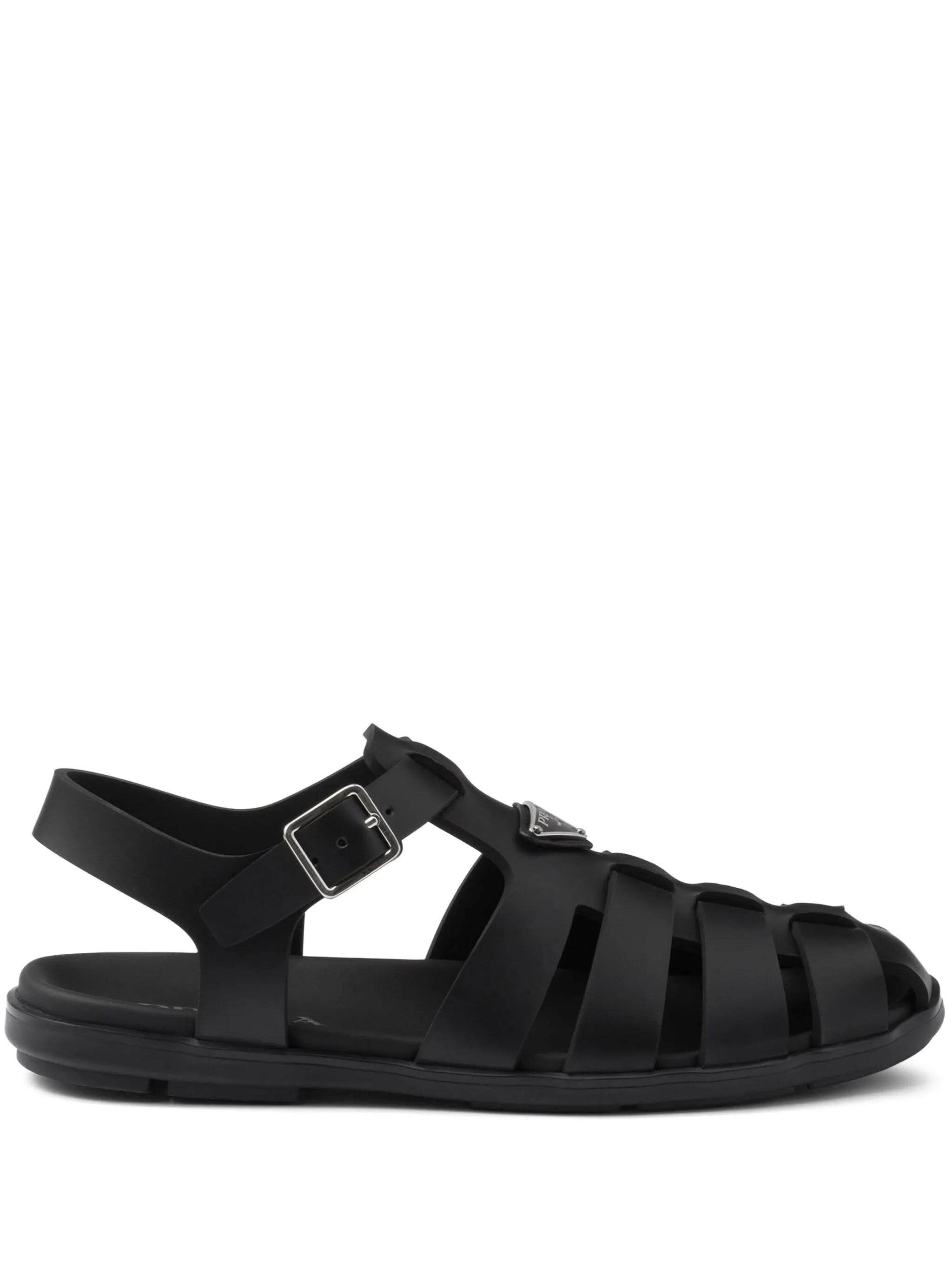 - black - enamel triangle logo - strap detailing - round toe - buckle fastening - rubber sole Materials & Product Care Lining: Leather 100% Outer: Rubber 100% Sole: Rubber 100%