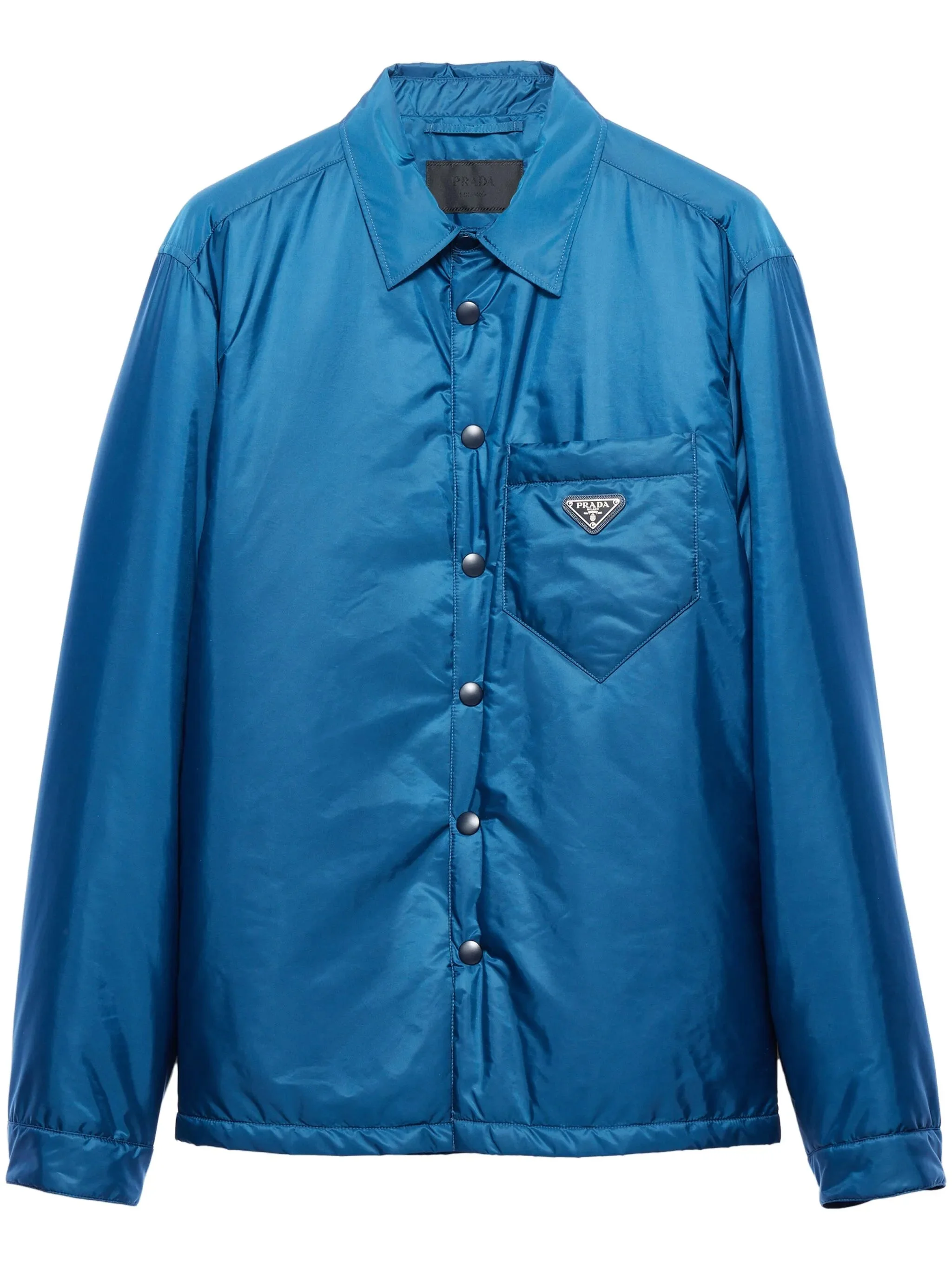 - royal blue - recycled nylon - padded design - front press-stud fastening - classic collar - long sleeves - press-stud fastening cuffs - enamel triangle logo - chest patch pocket - short side slits - full lining - straight hem Materials & Product Care Lining: Polyester 45%, Recycled Polyamide 100%, Recycled Polyester 55% Outer: Calf Leather 100%, Recycled Polyamide 100% Size & Fit - Designed for a regular fit, allowing for a comfortably loose fit throughout the body - Made from a padded non-stretch fabric, giving it no natural elasticity