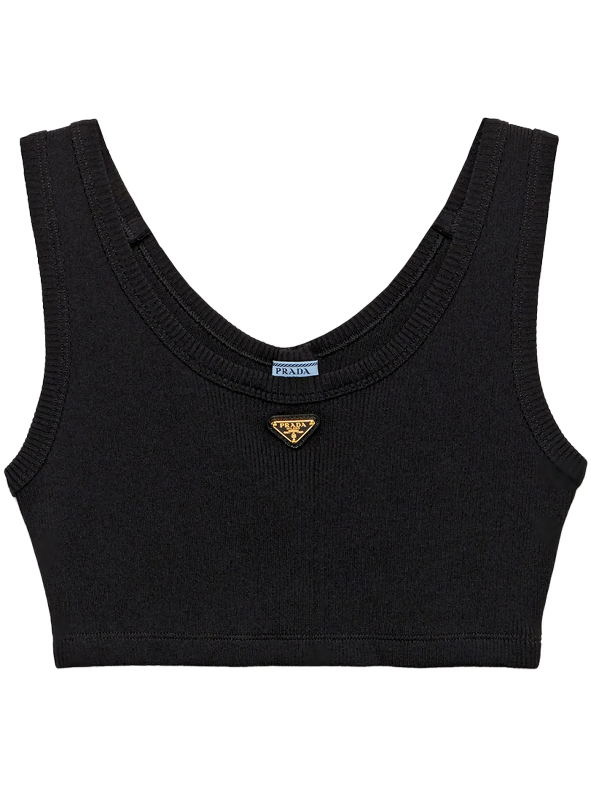 - black - ribbed detailing - enamel triangle logo - scoop neck - sleeveless - straight hem - cropped Materials & Product Care Polyamide 13%, Spandex/Elastane 2%, viscose 85%