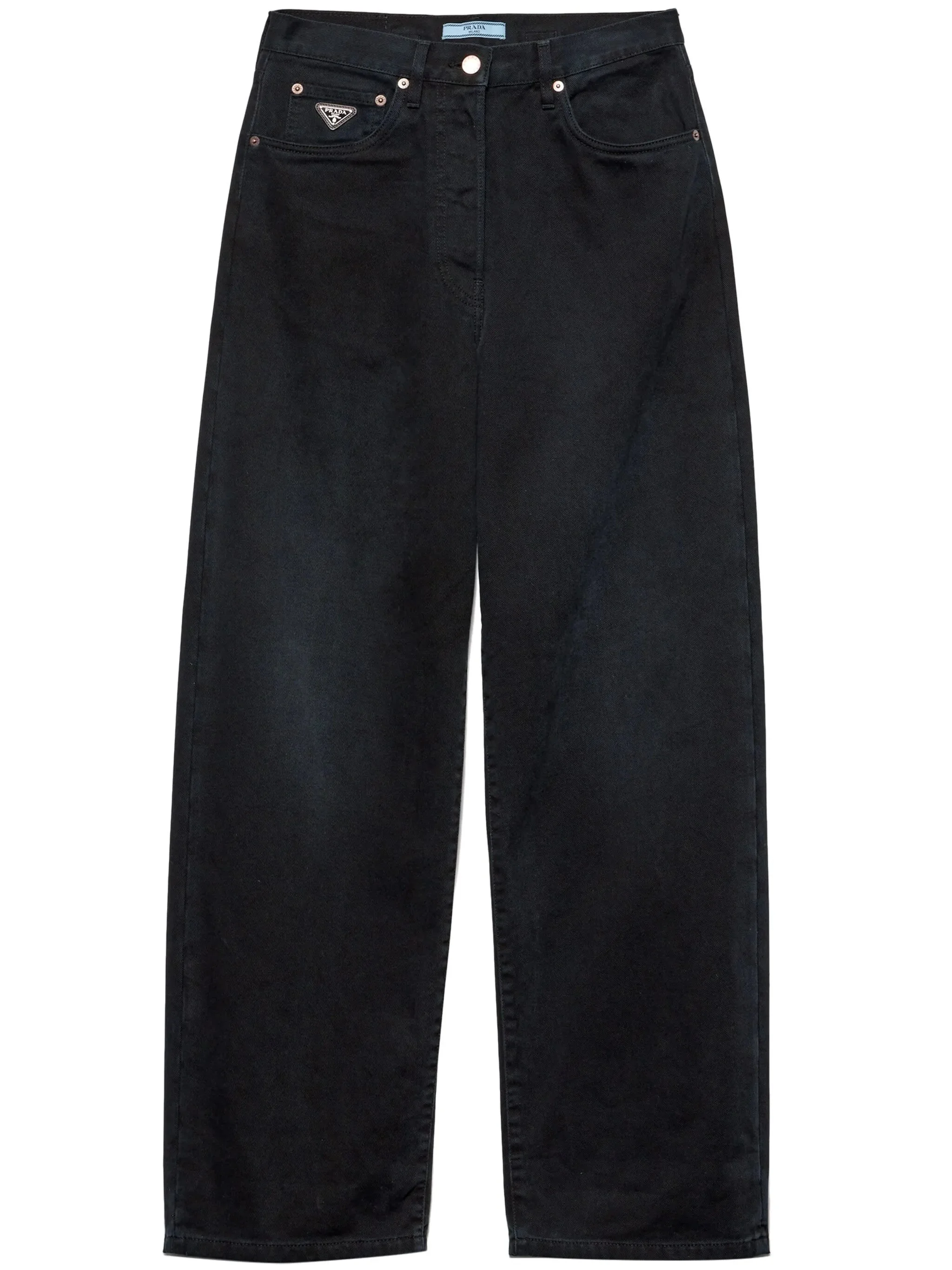 - black - cotton - denim - selvedge - enamel triangle logo - logo patch to the rear - low-rise - front button and zip fastening - rear buckle fastening - belt loops - classic five pockets - rear buckle detail - wide leg Materials & Product Care Lining: Cotton 100% Outer: Calfskin 100%, Cotton 100%