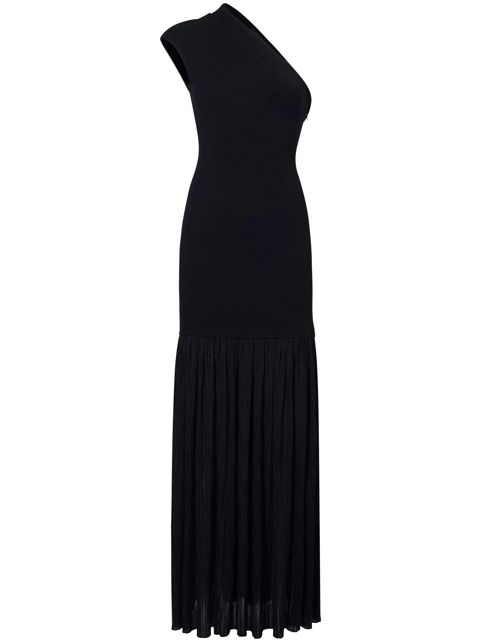 - black - chiffon crepe - concealed side zip fastening - one-shoulder - pleated skirt - maxi - straight hem Materials & Product Care Polyester 100%