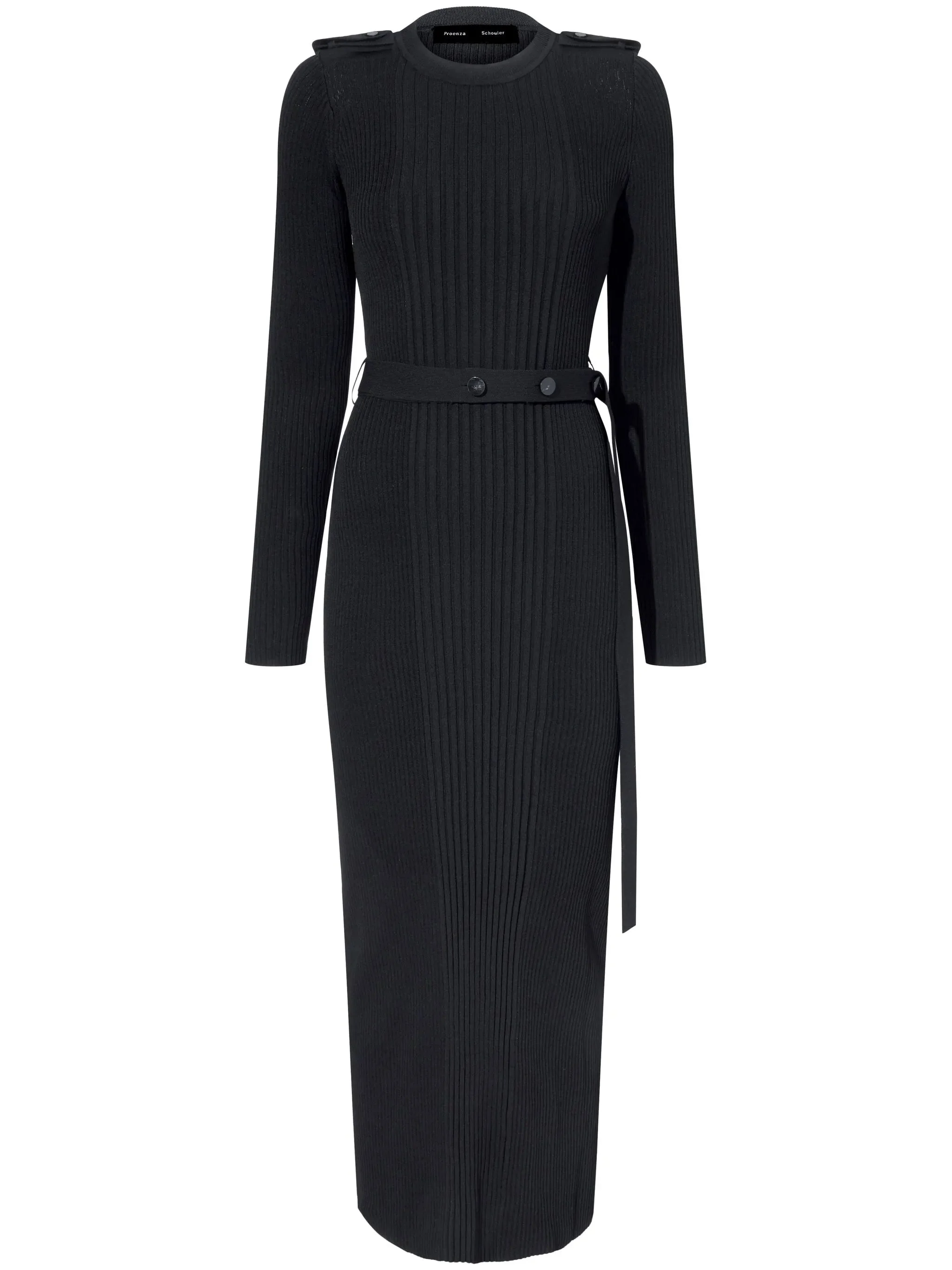 - black - silk - ribbed knit - epaulettes - crew neck - long sleeves - belted waist - rear slit - long length - straight hem Materials & Product Care Polyamide 100%, Silk 100%, viscose 100%