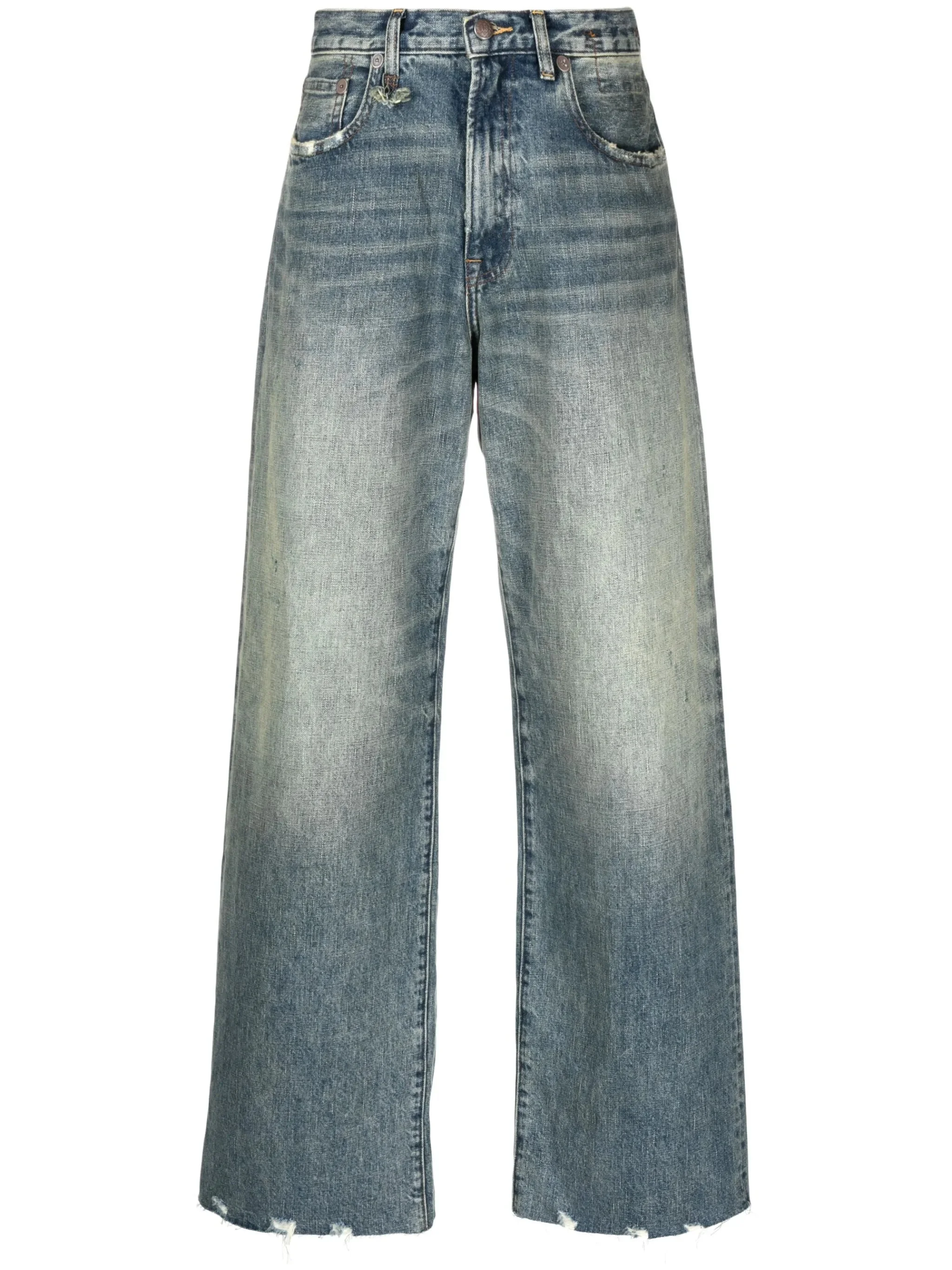 - indigo blue - cotton - washed denim - distressed finish - whiskering effect at the thighs - logo patch to the rear - decorative stitching - wide leg - high-rise - concealed fly and button fastening - belt loops - classic five pockets - raw-cut hem Materials & Product Care Calf Leather 100%, Cotton 100% Size & Fit - The model is 1.80 m wearing size 27.