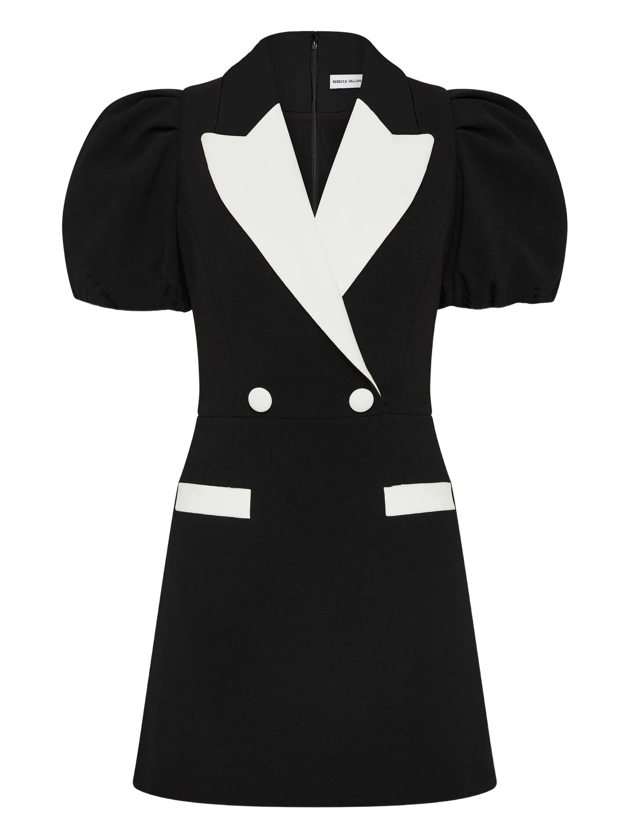 - black - white contrast collar - double-breasted fastening - puff sleeves - short sleeves - welt pockets Materials & Product Care Elastane 3%, Polyester 97%