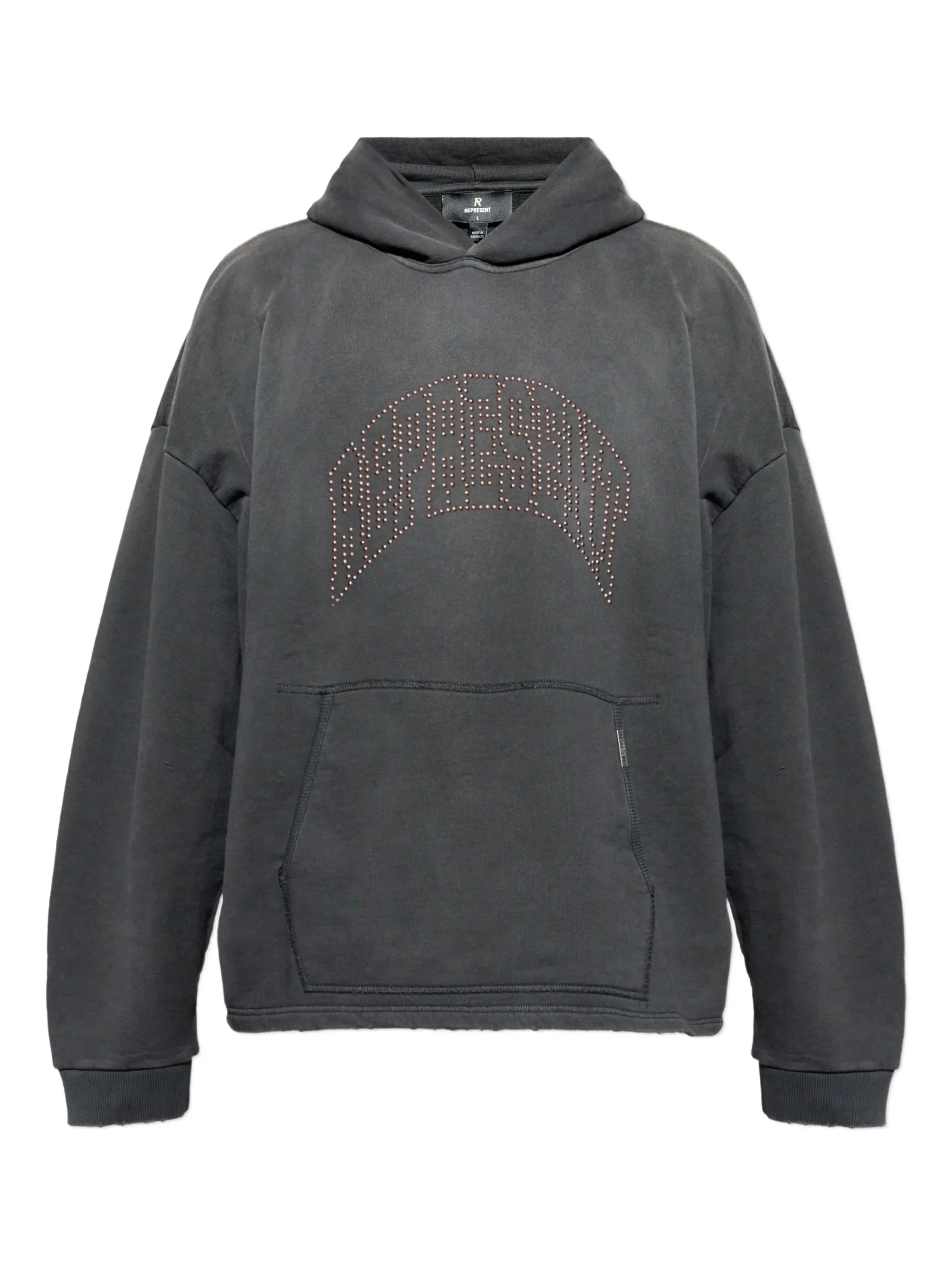 - stained black - studded embellishment - hooded - front pouch pocket - raw hem Materials & Product Care Cotton 100%