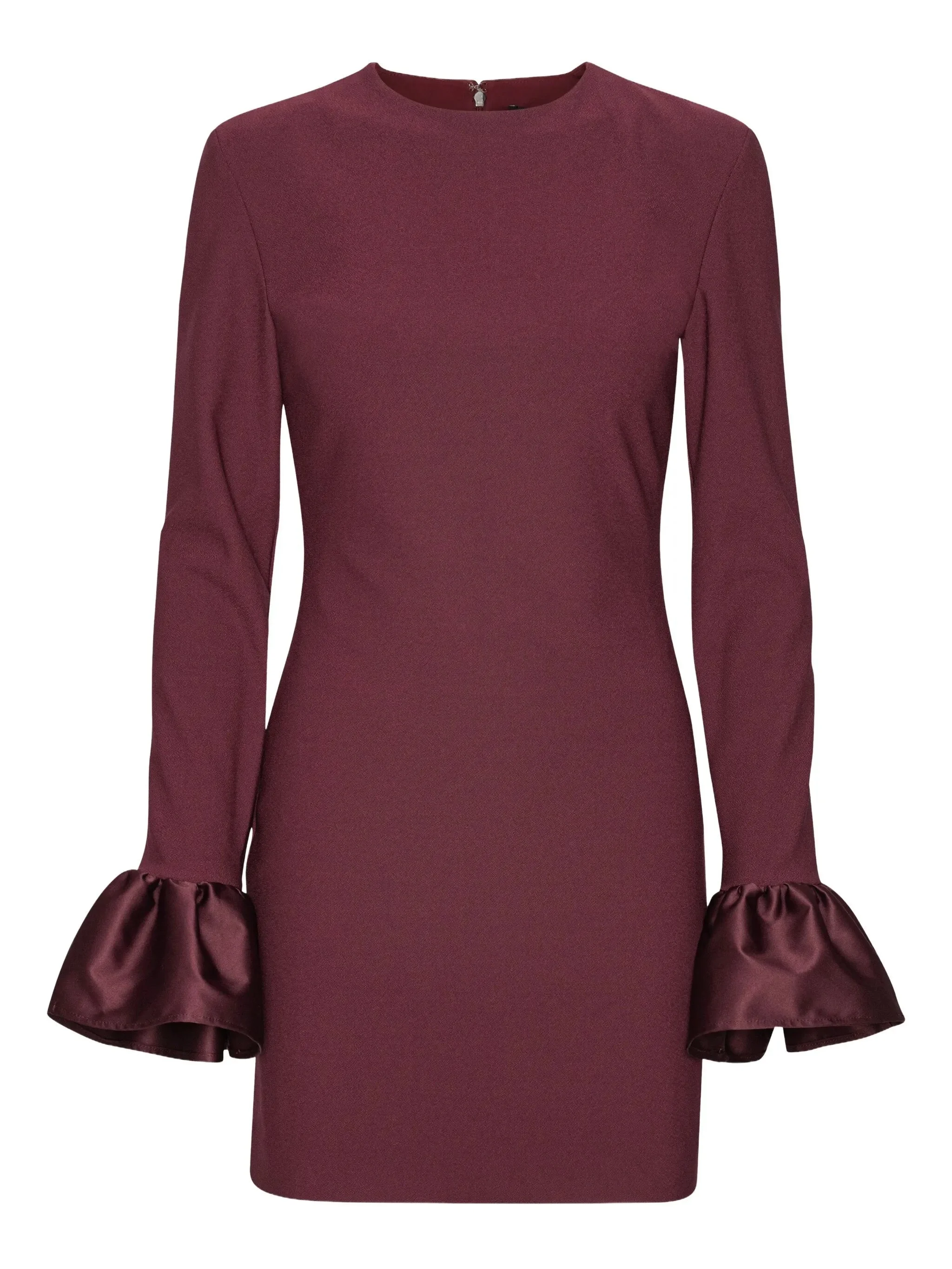 - zinfandel - frill sleeves - long sleeves - mini length - round neck - rear zip fastening Materials & Product Care Lining: Elastane 5%, Recycled Polyester 95% Outer: Recycled Polyester 100%