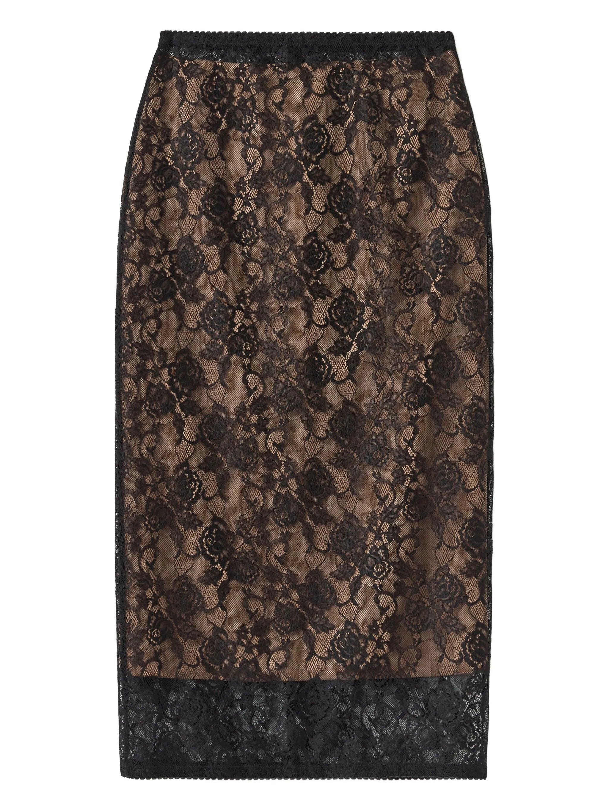 - black - floral lace - midi length - straight hem - sheer panel Materials & Product Care Elastane 11%, Polyester 89%