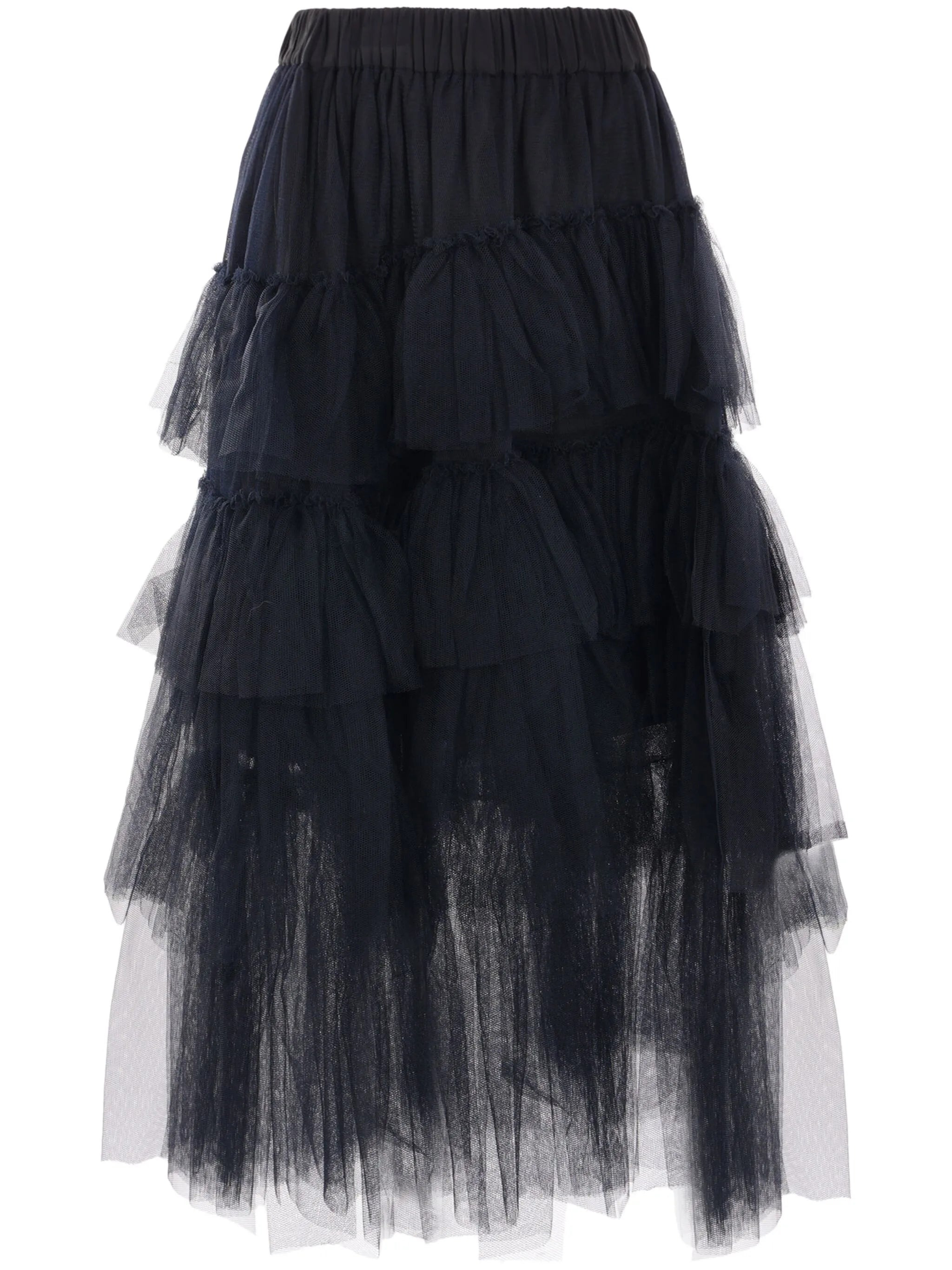 - black - elasticated waistband - asymmetric design - tiered skirt - tulle netting - high-waisted Materials & Product Care Lining: Acetate 60%, Cupro 40% Outer: Nylon 100% Size & Fit - Made from a midweight non-stretch fabric - The elasticated waist allows for a comfortable fit - This midi-length skirt is intended to be worn high on the waist