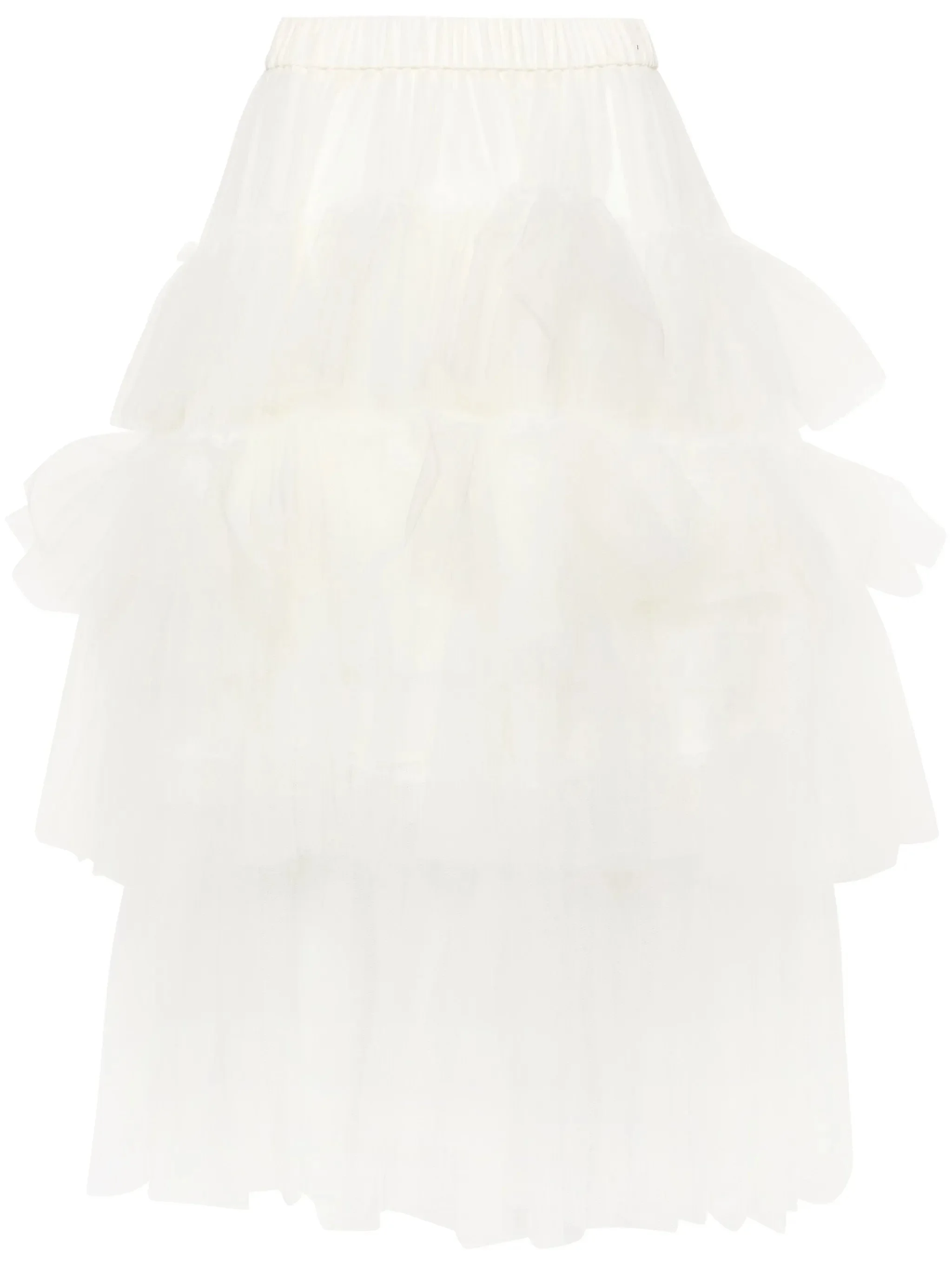 - white - tulle overlay - fully ruffled - elasticated waistband - flared hem - full lining Materials & Product Care Lining: Acetate 60%, Cupro 40% Outer: Acetate 73%, Nylon 100%, Polyamide 100%, Silk 27% Size & Fit - Made from a midweight non-stretch fabric - The elasticated waist allows for a comfortable fit - This midi-length skirt is intended to be worn high on the waist - This piece fits true to size – take your usual size - The model is 1.77 m wearing size 8.