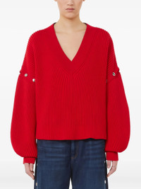 - red - V-neck - ribbed knit - balloon sleeves - convertible sleeves Materials & Product Care Virgin Wool 100%