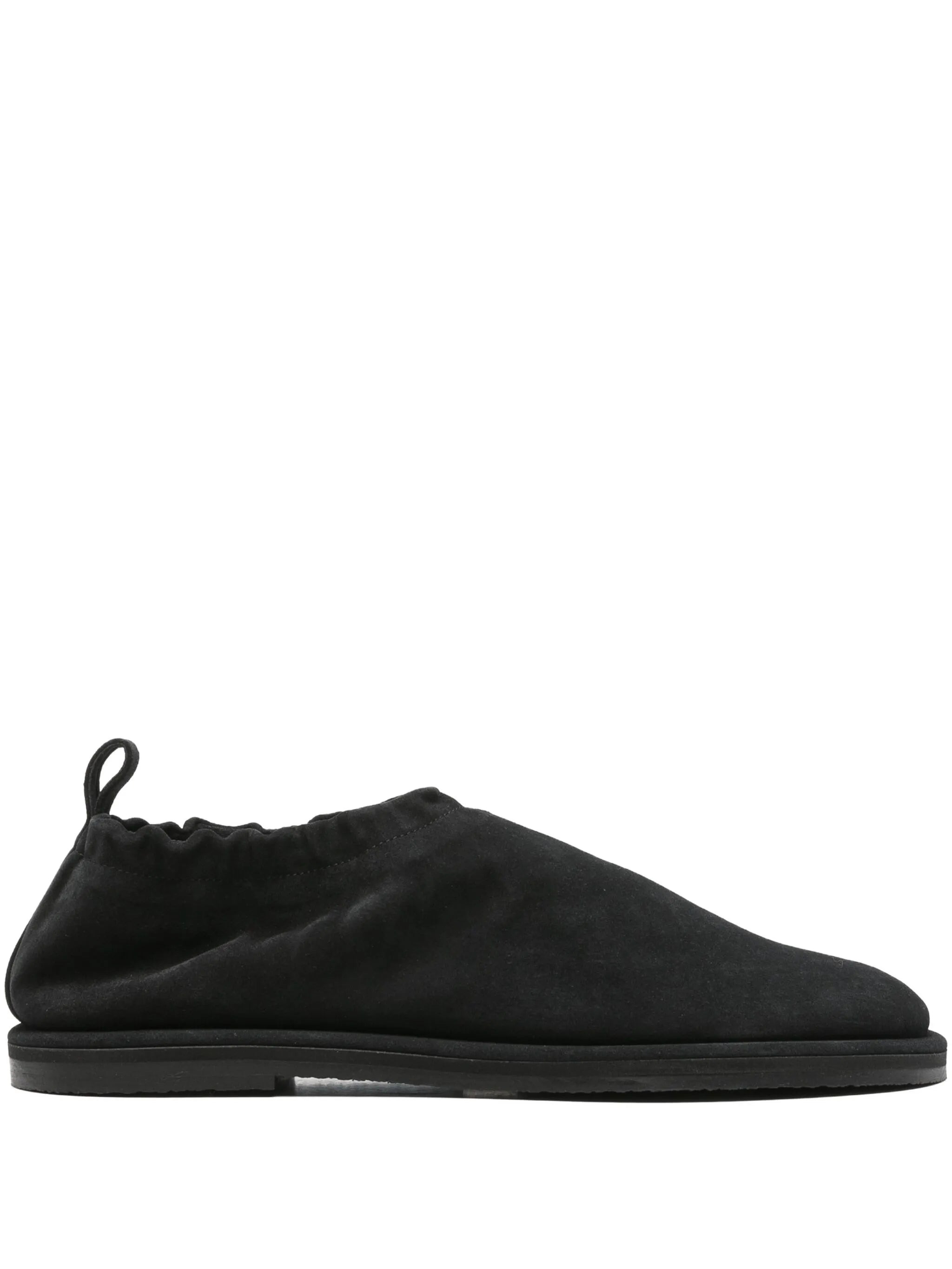- black - suede - elasticated trim - pull-tab at the rear - flat rubber sole Materials & Product Care Lining: Calf Leather 100% Outer: Suede 100% Sole: Rubber 100%