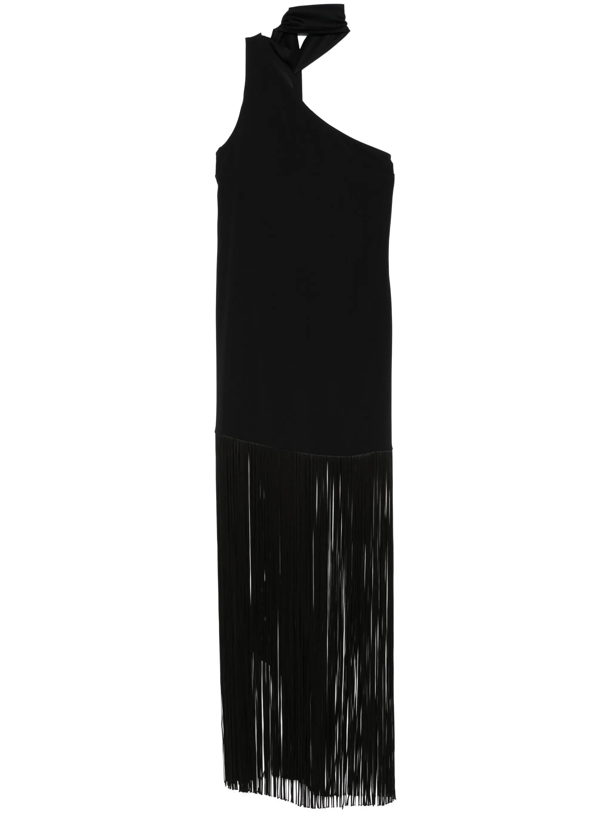 - black - cady texture - concealed side zip fastening - asymmetric neck - sleeveless - scarf detailing - full lining - fringe detailing Materials & Product Care Acetate 74%, Elastane 4%, viscose 22% Size & Fit - Designed for a slim fit that sits just away from the body offering a close yet comfortable fit - Made from a midweight stretch fabric, this piece offers elasticity and flexibility when worn - The model is 1.80 m wearing size 40.
