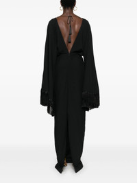 - black - crepe texture - concealed rear zip fastening - plunging V-neck - long wide sleeves - fringe detailing - side slit - straight hem Materials & Product Care Acetate 78%, viscose 22% Size & Fit - Designed for a loose fit at the chest with a close fit over the waist and hips - Made from a midweight non-stretch fabric - The vented hem offers movement at the rear - The model is 1.77 m wearing size 40.