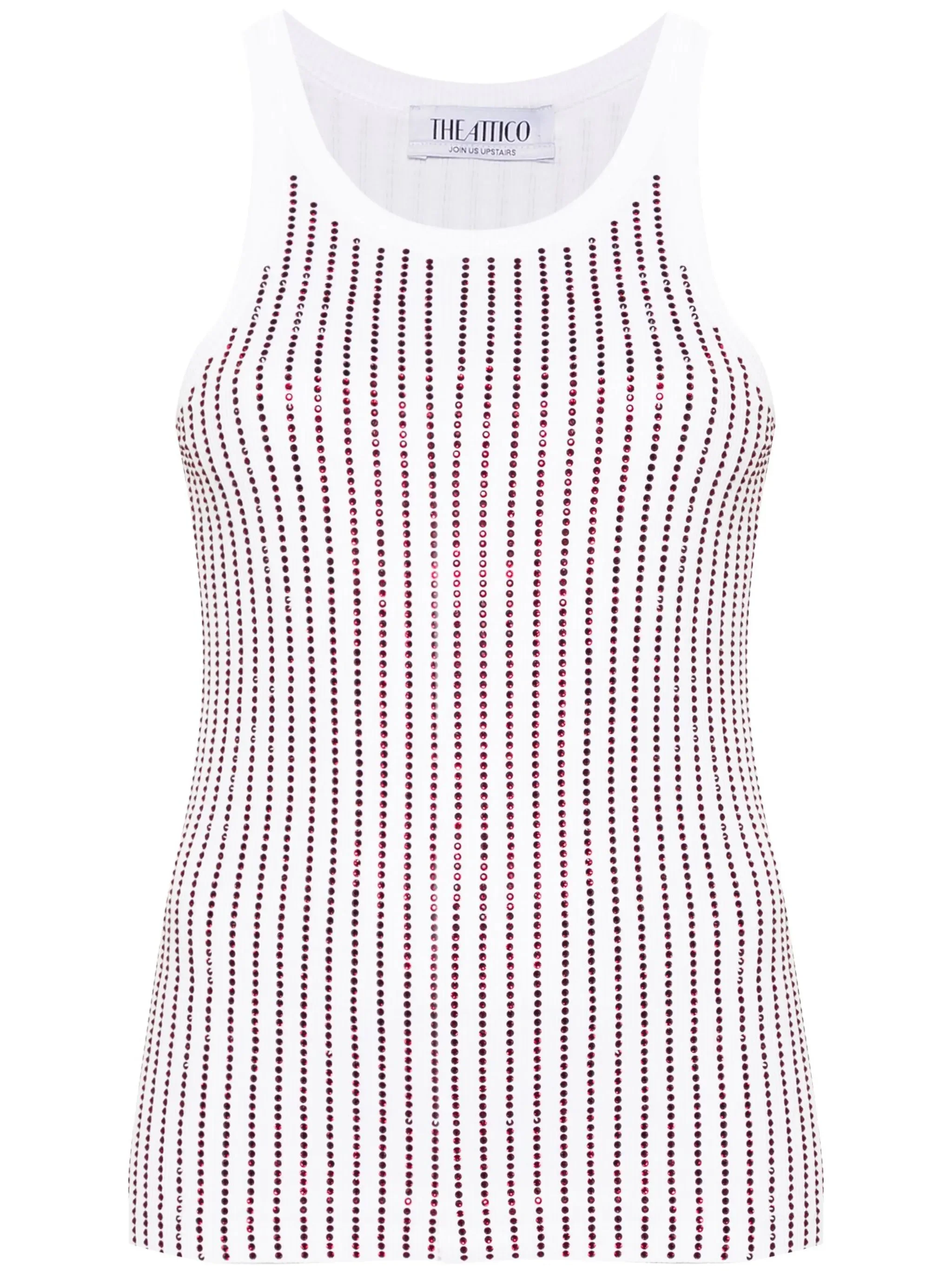 - white - cotton - fine ribbed - crystal embellishment - scoop neck - sleeveless - racerback - straight hem Materials & Product Care Cotton 100% Size & Fit - Designed for a slim fit that sits just away from the body offering a close yet comfortable fit - Made with a midweight knit, this piece offers some stretch - This piece fits true to size – take your usual size - The model is 1.74 m wearing size 40.