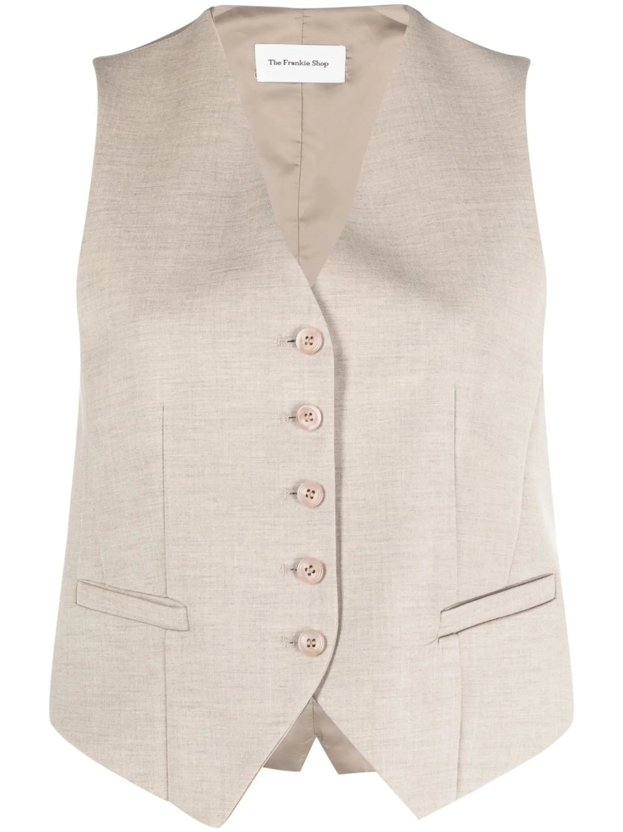- beige - wool blend - V-neck - front button fastening - two side welt pockets - sleeveless - adjustable fit Materials & Product Care Rayon 25%, Tencel 65%, Wool 10% Size & Fit - Cut for a slim fit - Made with a mid-weight non-stretch fabric - This piece fits true to size. We recommend you get your regular size - The model is 1.80 m wearing size S.