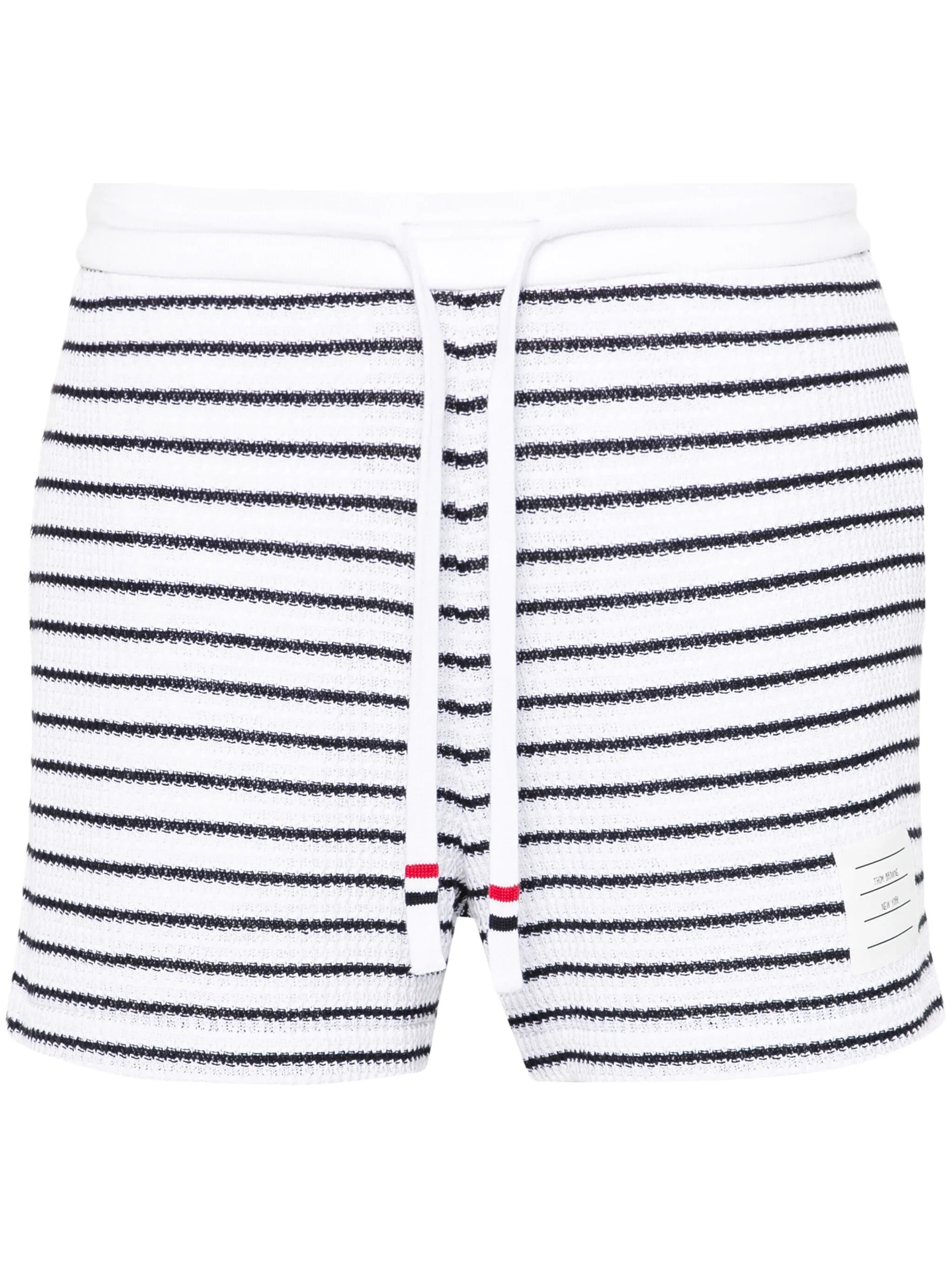 - white/navy blue - cotton - knitted construction - horizontal stripe pattern - signature 4-Bar tab - ribbed drawstring waistband - two side slit pockets - straight hem - thigh-length Materials & Product Care Cotton 100% Size & Fit - Adjust this piece’s waistband to your preference using the drawstring - Designed for a relaxed, roomy fit - Made with a midweight knit, this piece offers some stretch - This piece fits true to size – take your usual size - The model is 1.74 m wearing size 40.