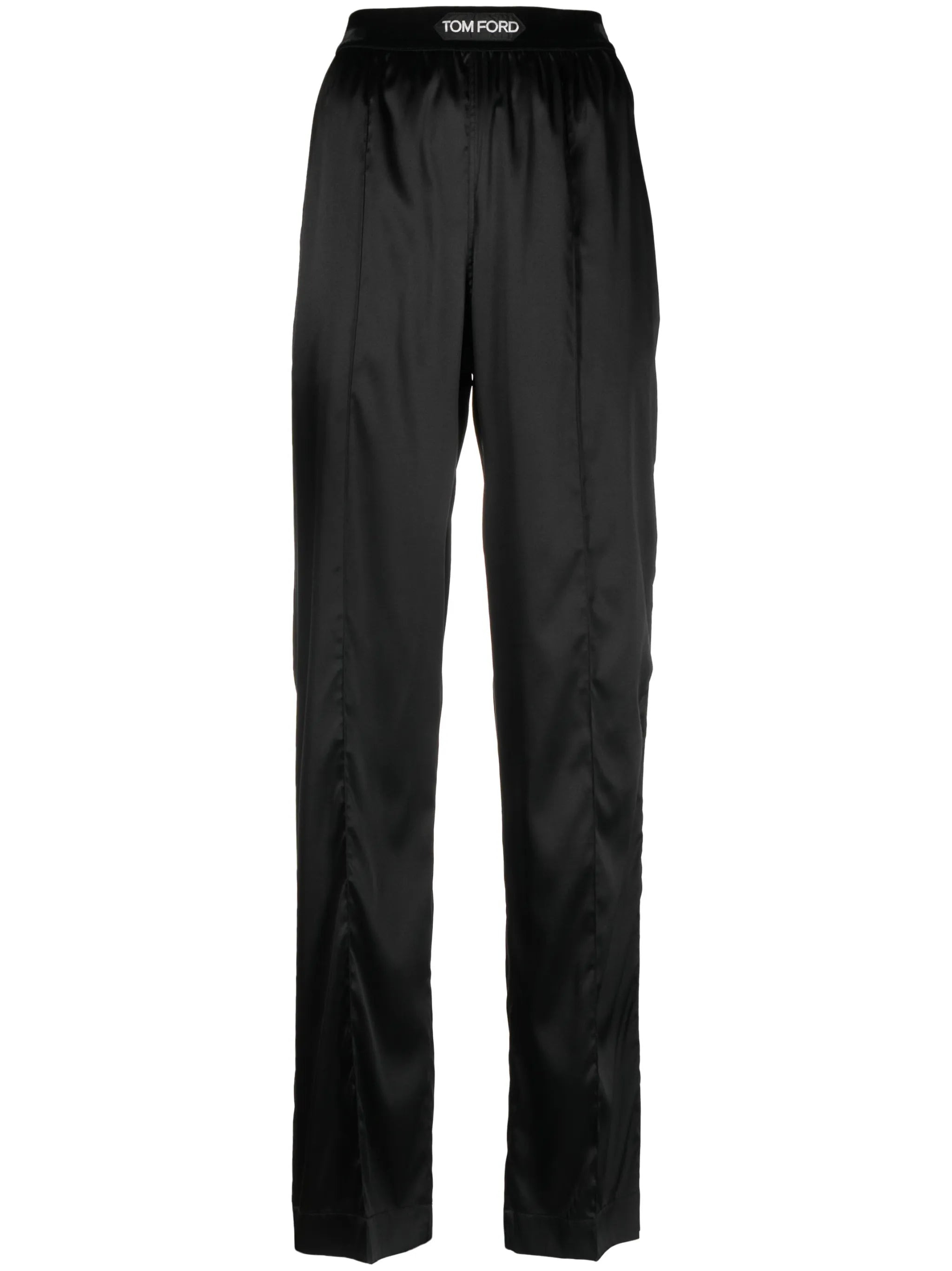 - jet black - stretch-silk - satin finish - logo waistband - high-waisted - elasticated waistband - two side inset pockets - two rear patch pockets - straight leg Materials & Product Care Elastane 6%, Polyamide 100%, Silk 94% Size & Fit - The model is 1.77 m wearing size S.