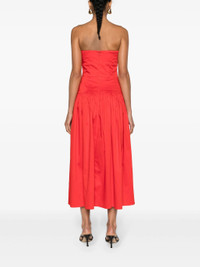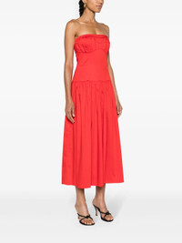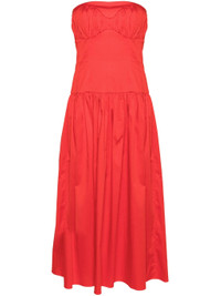 - cardinal red - cotton blend - strapless - concealed rear zip fastening - corset-style waist with boned bodice - pleated skirt - straight hem - mid-length Materials & Product Care Cotton 97%, Elastane 3% Size & Fit - Designed for a close fit at the chest and waist with a loose fit at the hip - Made from a midweight non-stretch fabric - This piece fits true to size – take your usual size - The model is 1.78 m wearing size 36.