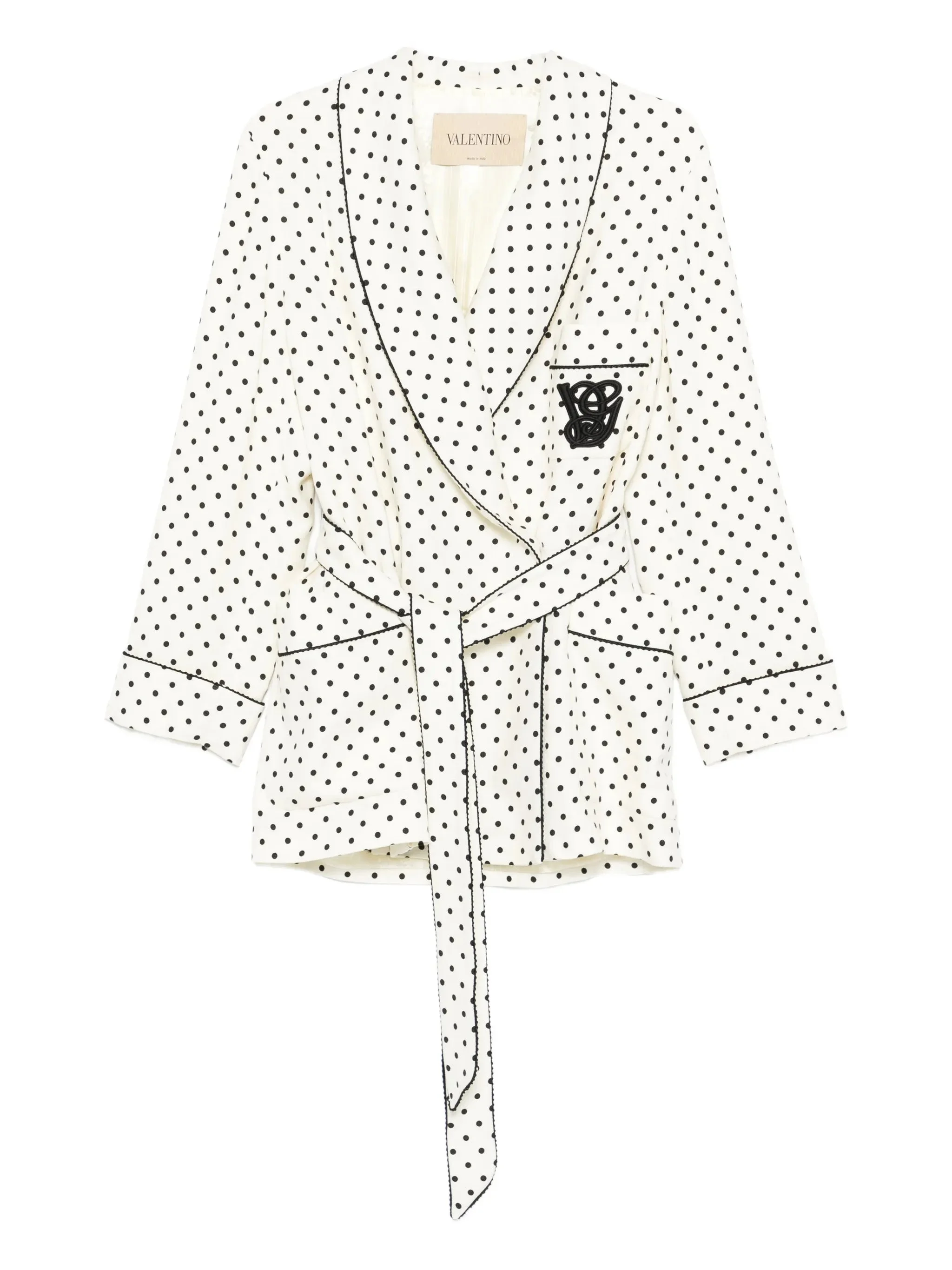 - white - polka dot print - self-tie fastening - piped edges - notched lapels - patch pockets Materials & Product Care Lining: viscose 100% Outer: Polyester 100%, viscose 100% Size & Fit - The model is 1.76 m wearing size 40.